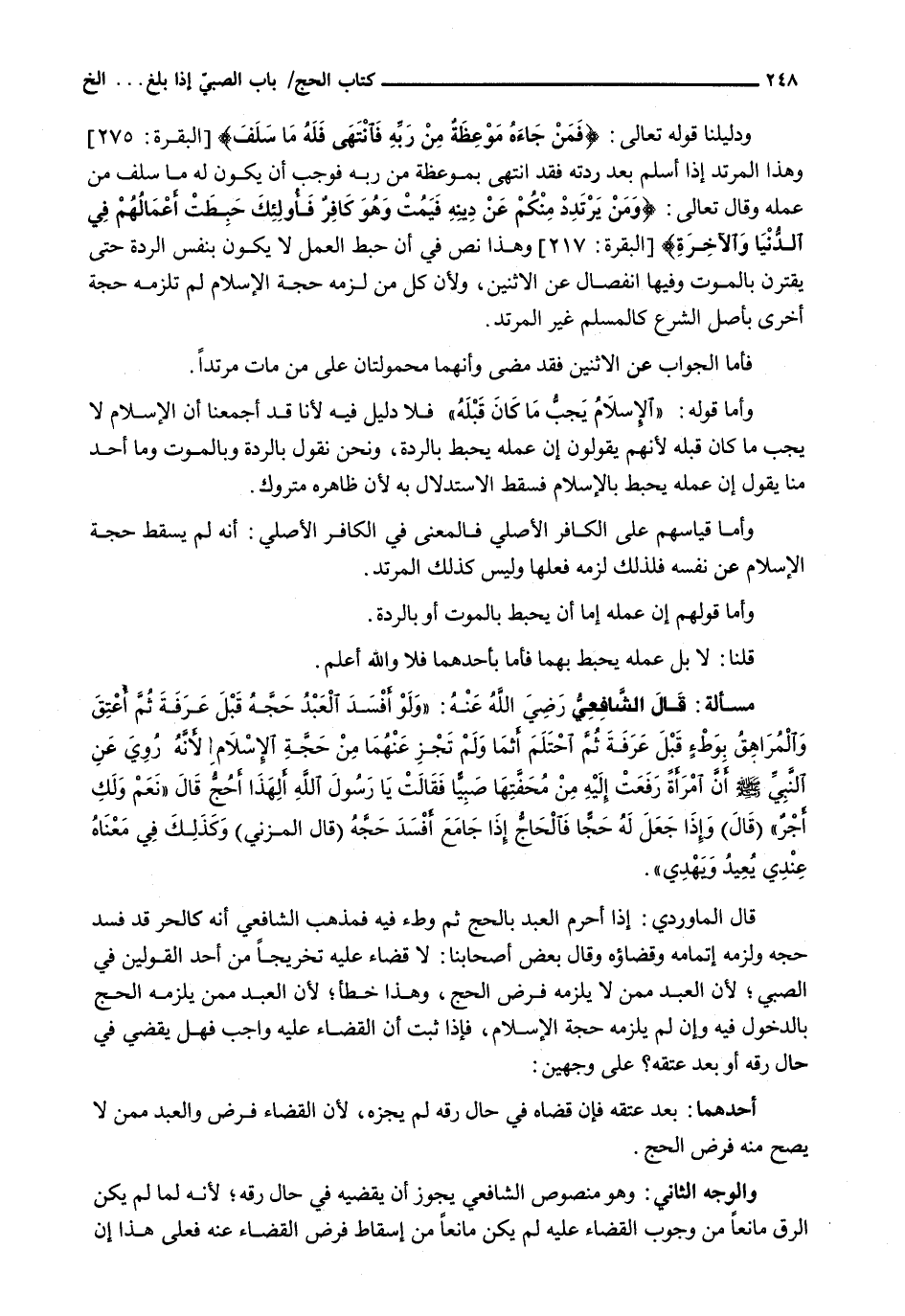 وَدَلِيلُنَا قَوْله تَعَالَى: {فَمَنْ جَاءَهُ مَوْعِظَةٌ مِنْ رَبِّهِ فَانْتَهَى فَلَهُ مَا سَلَفَ) {البقرة: 275) وَهَذَا الْمُرْتَدُّ إِذَا أَسْلَمَ بَعْدَ رِدَّتِهِ فَقَدِ انْتَهَى بِمَوْعِظَةٍ مِنْ رَبِّهِ فَوَجَبَ أَنْ يَكُونَ لَهُ مَا سَلَفَ مِنْ عَمَلِهِ وَقَالَ تَعَالَى: {وَمَنْ يَرْتَدِدْ مِنْكُمْ عَنْ دِينهِ فَيَمُتْ وَهُوَ كَافِرٌ فَأُولِئِكَ حَبِطَتْ أعْمَالُهُمْ فِي الدُّنْيا والآخِرَةِ) {البقرة: 217) وَهَذَا نَصٌّ فِي أَنْ حَبْطَ الْعَمَلِ لَا يَكُونُ بِنَفْسِ الرِّدَّةِ حَتَّى يَقْتَرِنَ بِالْمَوْتِ وَفِيهَا انفصال عن الاثنين، وَلِأَنَّ كُلَّ مَنْ لَزِمَهُ حَجَّةُ الْإِسْلَامِ لَمْ تَلْزَمْهُ حَجَّةٌ أُخْرَى بِأَصْلِ الشَّرْعِ كَالْمُسْلِمِ غَيْرِ المرتد.