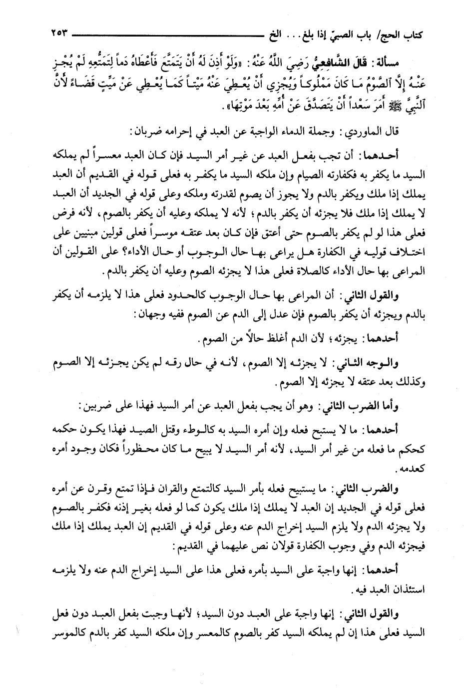 وَالضَّرْبُ الثَّانِي: مَا يستبيح فِعْلُهُ بِأَمْرِ السَّيِّدِ كَالتَّمَتُّعِ وَالْقِرَانِ فَإِذَا تَمَتَّعَ وَقَرَنَ عَنْ أَمْرِهِ فَعَلَى قَوْلِهِ فِي الْجَدِيدِ إِنَّ الْعَبْدَ لَا يَمْلِكُ إِذَا مُلِّكَ يَكُونُ كَمَا لَوْ فَعَلَهُ بِغَيْرِ إِذْنِهِ فَكَفَّرَ بِالصَّوْمِ وَلَا يُجْزِئُهُ الدَّمُ وَلَا يَلْزَمُ السَّيِّدَ إِخْرَاجُ الدَّمِ عَنْهُ وَعَلَى قَوْلِهِ فِي الْقَدِيمِ إِنَّ الْعَبْدَ يَمْلِكُ إِذَا مُلِّكَ فَيُجْزِئُهُ الدَّمُ وَفِي وُجُوبِ الْكَفَّارَةِ قَوْلَانِ نَصَّ عَلَيْهِمَا فِي الْقَدِيمِ.