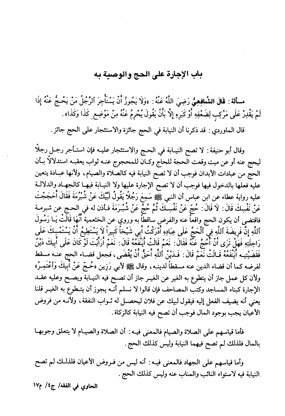 قَالَ الْمَاوَرْدِيُّ: قَدْ ذَكَرْنَا أَنَّ النِّيَابَةَ فِي الْحَجِّ جَائِزَةٌ وَالِاسْتِئْجَارَ عَلَى الْحَجِّ جَائِزٌ.