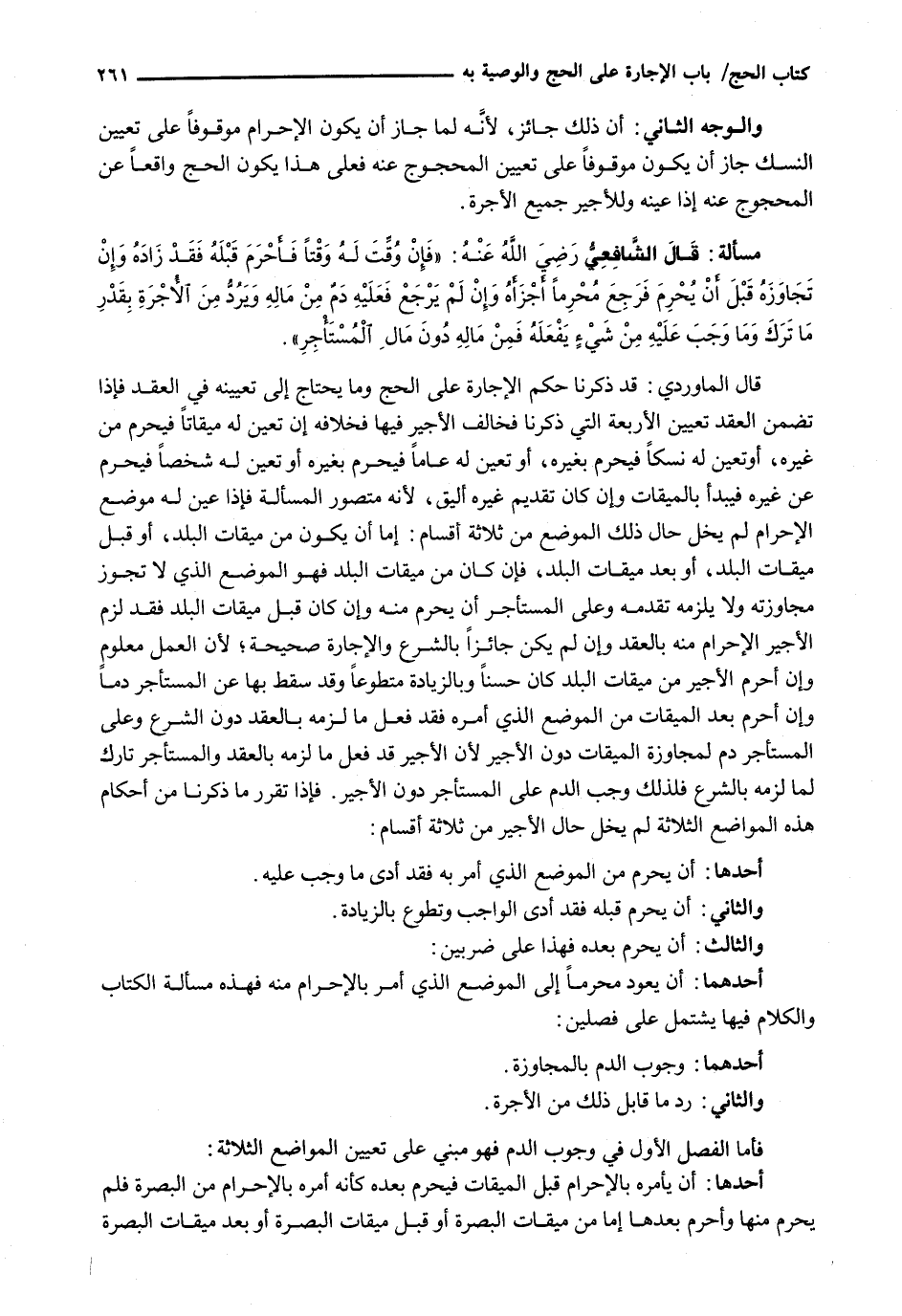 قَالَ الْمَاوَرْدِيُّ: قَدْ ذَكَرْنَا حُكْمَ الْإِجَارَةِ عَلَى الْحَجِّ وَمَا يُحْتَاجُ إِلَى تَعْيِينِهِ فِي الْعَقْدِ فَإِذَا تَضَمَّنَ الْعَقْدُ تَعْيِينَ الْأَرْبَعَةِ الَّتِي ذَكَرْنَا فخالف الأجير فيها فخلافه إن تعين له ميقاتاً فيحرم من غيره، أو تعيين له نسكاً فيحرم بغيره، أو تعين له عاماً فيحرم بغيره أو تعين لَهُ شَخْصًا فَيُحْرِمُ عَنْ غَيْرِهِ فَيَبْدَأُ بِالْمِيقَاتِ وَإِنْ كَانَ تَقْدِيمُ غَيْرِهِ أَلْيَقَ، لِأَنَّهُ مُتَصَوِّرُ الْمَسْأَلَةِ فَإِذَا عُيِّنَ لَهُ مَوْضِعُ الْإِحْرَامِ لَمْ يَخْلُ حَالُ ذَلِكَ الْمَوْضِعِ مِنْ ثَلَاثَةِ أَقْسَامٍ: إِمَّا أَنْ يَكُونَ مِنْ مِيقَاتِ الْبَلَدِ، أَوْ قَبْلَ مِيقَاتِ الْبَلَدِ، أَوْ بَعْدَ مِيقَاتِ الْبَلَدِ، فَإِنْ كَانَ مِنْ مِيقَاتِ الْبَلَدِ فَهُوَ الْمَوْضِعُ الَّذِي لَا تَجُوزُ مُجَاوَزَتُهُ وَلَا يَلْزَمُهُ تَقَدُّمُهُ وَعَلَى الْمُسْتَأْجِرِ أَنْ يُحْرِمَ مِنْهُ وَإِنْ كَانَ قَبْلَ مِيقَاتِ الْبَلَدِ فَقَدْ لَزِمَ الْأَجِيرَ الْإِحْرَامُ مِنْهُ بِالْعَقْدِ وَإِنْ لَمْ يَكُنْ جَائِزًا بِالشَّرْعِ وَالْإِجَارَةُ صَحِيحَةٌ؛ لِأَنَّ الْعَمَلَ مَعْلُومٌ وَإِنْ أَحْرَمَ الْأَجِيرُ مِنْ مِيقَاتِ الْبَلَدِ كَانَ حَسَنًا وَبِالزِّيَادَةِ مُتَطَوِّعًا وَقَدْ سَقَطَ بِهَا عَنِ الْمُسْتَأْجِرِ دَمًا وَإِنْ أَحْرَمَ بَعْدَ الْمِيقَاتِ مِنَ الْمَوْضِعِ الَّذِي أَمَرَهُ فَقَدْ فَعَلَ مَا لَزِمَهُ بِالْعَقْدِ دُونَ الشَّرْعِ وَعَلَى الْمُسْتَأْجِرِ دَمٌ لِمُجَاوَزَةِ الْمِيقَاتِ دُونَ الْأَجِيرِ لِأَنَّ الْأَجِيرَ قَدْ فَعَلَ مَا لَزِمَهُ بِالْعَقْدِ وَالْمُسْتَأْجِرُ تَارِكٌ لِمَا لَزِمَهُ بِالشَّرْعِ فَلِذَلِكَ وَجَبَ الدَّمُ عَلَى الْمُسْتَأْجِرِ دُونَ الْأَجِيرِ. فَإِذَا تَقَرَّرَ مَا ذَكَرْنَا مِنْ أَحْكَامِ هَذِهِ الْمَوَاضِعِ الثَّلَاثَةِ لَمْ يَخْلُ حَالُ الْأَجِيرِ مِنْ ثَلَاثَةِ أَقْسَامٍ: