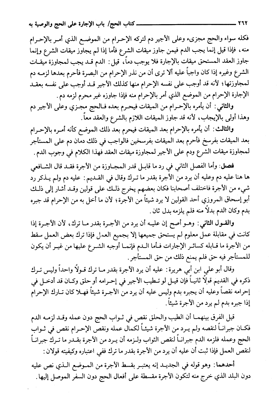 : وَأَمَّا الْفَصْلُ الثَّانِي فِي رَدِّ مَا قَابَلَ قَدْرَ الْمُجَاوَزَةِ مِنَ الْأُجْرَةِ فَقَدْ قَالَ الشَّافِعِيُّ هَاهُنَا عَلَيْهِ دَمٌ وَعَلَيْهِ أَنْ يَرُدَّ مِنَ الْأُجْرَةِ بِقَدْرِ مَا تَرَكَ وَقَالَ فِي الْقَدِيمِ: عَلَيْهِ دَمٌ وَلَمْ يَذْكُرْ رَدَّ شَيْءٍ مِنَ الْأُجْرَةِ فَاخْتَلَفَ أَصْحَابُنَا فَكَانَ بَعْضُهُمْ يُخَرِّجُ ذَلِكَ عَلَى قَوْلَيْنِ وَقَدْ أَشَارَ إِلَى ذَلِكَ أَبُو إِسْحَاقَ الْمَرْوَزِيُّ أَحَدُ الْقَوْلَيْنِ لَا يَرُدُّ شَيْئًا مِنَ الْأُجْرَةِ؛ لِأَنَّ مَا أَخَلَّ بِهِ مِنَ الْإِحْرَامِ قَدْ جَبَرَهُ بِدَمٍ وَكَانَ الدَّمُ بَدَلًا مِنْهُ فَلَمْ يَلْزَمْهُ بَدَلٌ ثَانٍ.