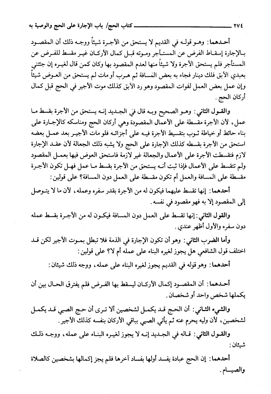 وَالْقَوْلُ الثَّانِي: وَهُوَ الصَّحِيحُ وَبِهِ قَالَ فِي الْجَدِيدِ إِنَّهُ يَسْتَحِقُّ مِنَ الْأُجْرَةِ بِقِسْطِ مَا عَمِلَ، لِأَنَّ الْأُجْرَةَ مُقَسَّطَةٌ عَلَى الْأَعْمَالِ الْمَقْصُودَةِ وَهِيَ أَرْكَانُ الْحَجِّ وَمَنَاسِكُهُ كَالْإِجَارَةِ عَلَى بِنَاءِ حَائِطٍ أَوْ خِيَاطَةِ ثَوْبٍ بِتَقْسِيطِ الْأُجْرَةِ فِيهِ عَلَى أَجْزَائِهِ فَلَوْ مَاتَ الْأَجِيرُ بَعْدَ عَمَلِ بَعْضِهِ اسْتَحَقَّ مِنَ الْأُجْرَةِ بِقِسْطِهِ كَذَلِكَ الْإِجَارَةُ عَلَى الْحَجِّ وَلَا يُشْبِهُ ذَلِكَ الْجَعَالَةَ لِأَنَّ عَقْدَ الْإِجَارَةِ لَازِمٌ فَتَقَسَّطَتِ الْأُجْرَةُ عَلَى الْأَعْمَالِ وَالْجَعَالَةُ غَيْرُ لَازِمَةٍ فَاسْتَحَقَّ الْعِوَضَ فِيهَا بِعَمَلِ الْمَقْصُودِ وَلَمْ تَتَقَسَّطْ عَلَى الْأَعْمَالِ فَإِذَا ثَبَتَ أَنَّهُ يَسْتَحِقُّ مِنَ الْأُجْرَةِ بِقِسْطِ مَا عَمِلَ فَهَلْ تَكُونُ الْأُجْرَةُ مُقَسَّطَةً عَلَى الْمَسَافَةِ وَالْعَمَلِ أَمْ تَكُونُ مُقَسَّطَةً عَلَى الْعَمَلِ دُونَ الْمَسَافَةِ؟ عَلَى قَوْلَيْنِ: