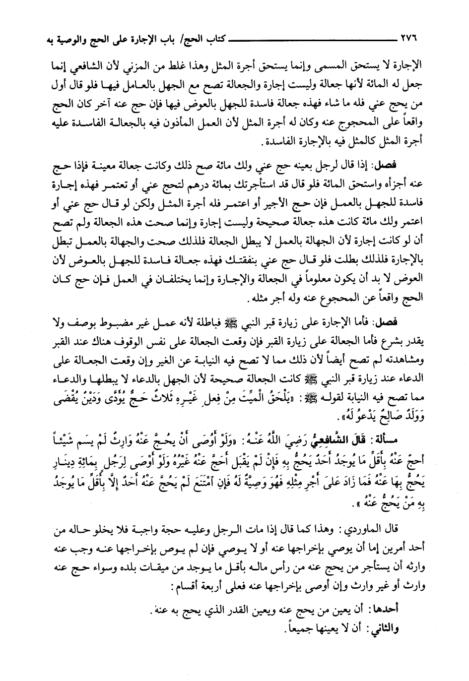 : فَأَمَّا الْإِجَارَةُ عَلَى زِيَارَةِ قبر النبي - صَلَّى اللَّهُ عَلَيْهِ وَسَلَّم َ - فَبَاطِلَةٌ لِأَنَّهُ عَمَلٌ غَيْرُ مَضْبُوطٍ بِوَصْفٍ وَلَا يُقَدَّرُ بِشَرْعٍ فَأَمَّا الْجَعَالَةُ عَلَى زِيَارَةِ الْقَبْرِ فَإِنْ وَقَعَتِ الْجَعَالَةُ عَلَى نَفْسِ الْوُقُوفِ هُنَاكَ عِنْدَ الْقَبْرِ وَمُشَاهَدَتِهِ لَمْ تَصِحَّ أَيْضًا لِأَنَّ ذَلِكَ مِمَّا لَا تَصِحُّ فِيهِ النِّيَابَةُ عَنِ الْغَيْرِ وَإِنْ وَقَعَتِ الْجَعَالَةُ عَلَى الدُّعَاءِ عِنْدَ زيارة قبر النبي - صَلَّى اللَّهُ عَلَيْهِ وَسَلَّم َ - كَانَتِ الْجَعَالَةُ صَحِيحَةً لِأَنَّ الْجَهْلَ بِالدُّعَاءِ لَا يُبْطِلُهَا وَالدُّعَاءُ مِمَّا تَصِحُّ فِيهِ النِّيَابَةُ لِقَوْلِهِ - صَلَّى اللَّهُ عَلَيْهِ وَسَلَّم َ -: " يَلْحَقُ الْمَيِّتَ مِنْ فِعْلِ غَيْرِهِ ثَلَاثٌ حَجٌّ يُؤَدَّى وَدَيْنٌ يُقْضَى وولدٌ صالحٌ يَدْعُو لَهُ ".