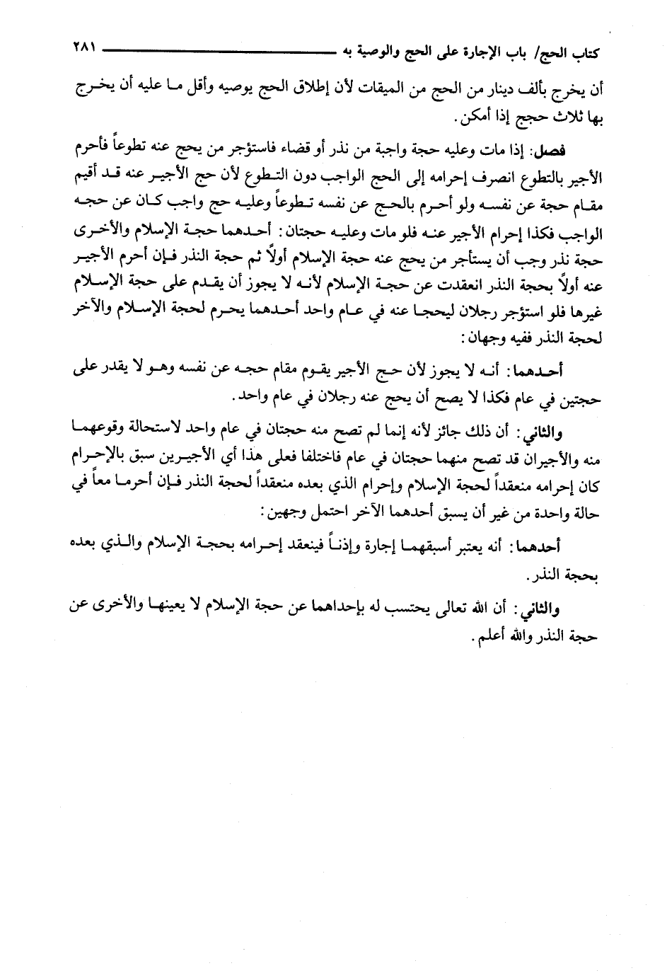 وَالثَّانِي: أَنَّ ذَلِكَ جَائِزٌ لِأَنَّهُ إِنَّمَا لَمْ تَصِحَّ مِنْهُ حَجَّتَانِ فِي عَامٍ وَاحِدٍ لِاسْتِحَالَةِ وُقُوعِهِمَا مِنْهُ وَالْأَجِيرَانِ قَدْ تَصِحُّ مِنْهُمَا حَجَّتَانِ فِي عَامٍ فَاخْتَلَفَا فَعَلَى هَذَا أَيُّ الْأَجِيرَيْنِ سَبَقَ بِالْإِحْرَامِ كَانَ إِحْرَامُهُ مُنْعَقِدًا لِحَجَّةِ الْإِسْلَامِ وَإِحْرَامُ الَّذِي بَعْدَهُ مُنْعَقِدًا لِحَجَّةِ النَّذْرِ فَإِنْ أَحْرَمَا مَعًا فِي حَالَةٍ وَاحِدَةٍ مِنْ غَيْرِ أَنْ يَسْبِقَ أَحَدُهُمَا الْآخَرَ احْتَمَلَ وَجْهَيْنِ: