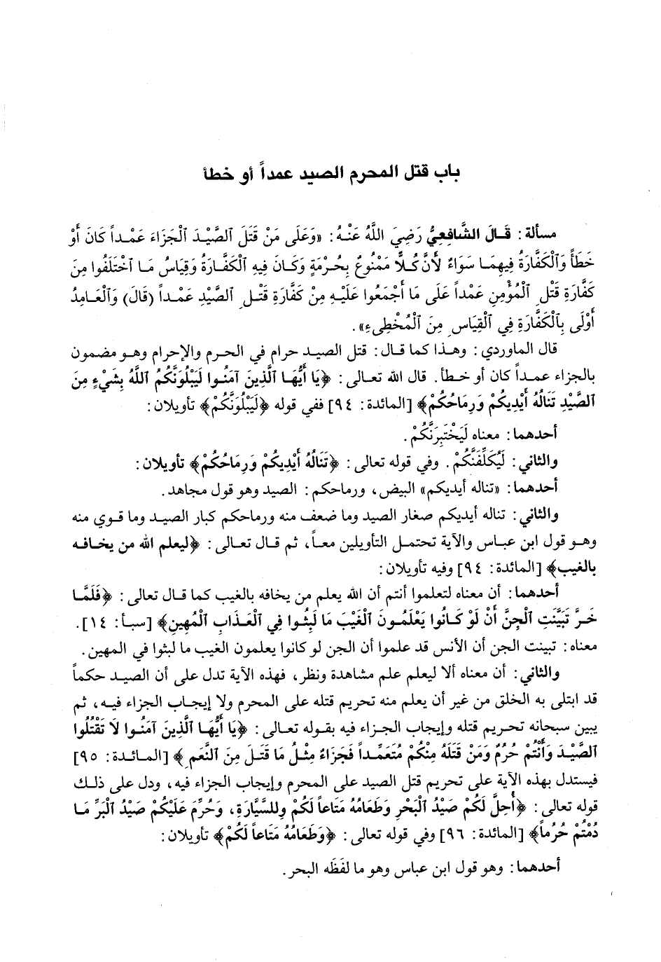 قَالَ الْمَاوَرْدِيُّ: وَهَذَا كَمَا قَالَ: قَتْلُ الصَّيْدِ حَرَامٌ فِي الْحَرَمِ وَالْإِحْرَامِ وَهُوَ مَضْمُونٌ بِالْجَزَاءِ عَمْدًا كَانَ أَوْ خَطَأً. قَالَ اللَّهُ تَعَالَى: {يَا أيُّهَا الّذِينَ آمَنُوا لَيَبْلُوَنَّكُمُ اللهُ بِشَيْءٍ مِنَ الصَّيْدِ تَنَالُهُ أَيْدِيكُمْ وَرِمَاحُكُمْ) {المائدة: 94) فَفِي قَوْلِهِ {لَيَبْلُوَنَّكُمْ} تَأْوِيلَانِ: