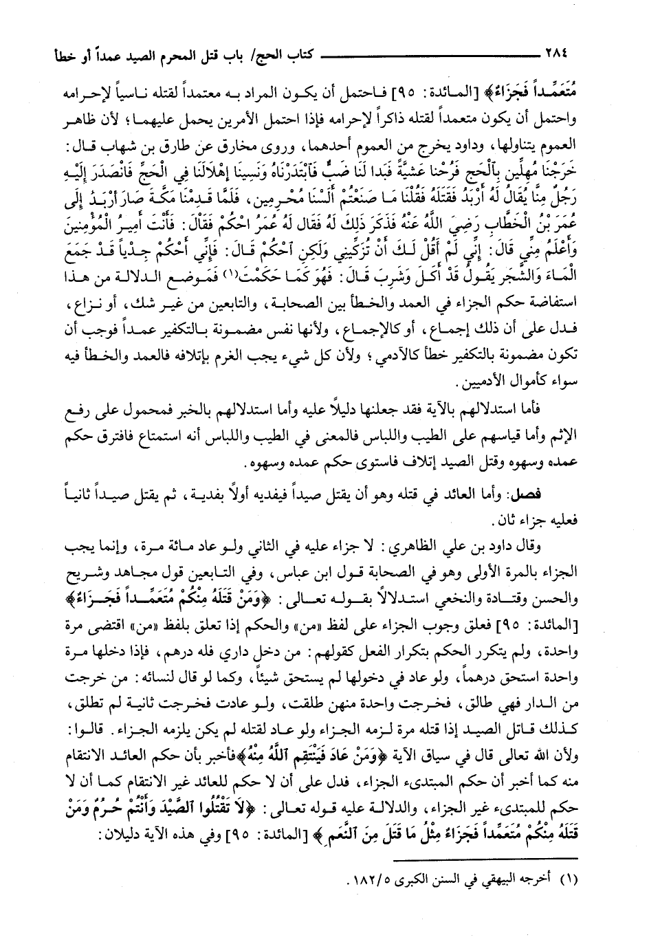 مُتَعَمِّداً فَجَزاءٌ) {المائدة: 95) فَاحْتَمَلَ أَنْ يَكُونَ الْمُرَادُ به معتمداً لِقَتْلِهِ نَاسِيًا لِإِحْرَامِهِ وَاحْتَمَلَ أَنْ يَكُونَ مُتَعَمِّدًا لِقَتْلِهِ ذَاكِرًا لِإِحْرَامِهِ فَإِذَا احْتَمَلَ الْأَمْرَيْنِ يُحْمَلُ عَلَيْهِمَا؛ لِأَنَّ ظَاهِرَ الْعُمُومِ يَتَنَاوَلُهَا، وَدَاوُدُ يُخْرِجُ مِنَ الْعُمُومِ أَحَدَهُمَا، وَرَوَى مُخَارِقٌ عَنْ طَارِقِ بْنِ شِهَابٍ قَالَ: خَرَجْنَا مُهِلِّينَ بِالْحَجِّ فَرُحْنَا عَشِيَّةً فَبَدَا لَنَا ضَبٌّ فَابْتَدَرْنَاهُ وَنَسِينَا إِهْلَالَنَا فِي الْحَجِّ فَانْصَدَرَ إِلَيْهِ رجلٌ مِنَّا يُقَالُ لَهُ أَرْبَدُ فَقَتَلَهُ فَقُلْنَا مَا صَنَعْتُمُ أَلَسْنَا مُحْرِمِينَ، فَلَمَّا قَدِمْنَا مَكَّةَ صَارَ إِرْبَدُ إِلَى عُمَرَ بْنِ الْخَطَّابِ رَضِيَ اللَّهُ عَنْهُ فَذَكَرَ ذَلِكَ لَهُ فَقَالَ لَهُ عُمَرُ احْكُمْ فَقَاْلَ: فَأَنْتَ أَمِيرُ الْمُؤْمِنِينَ وَأَعْلَمُ مِنِّي قَالَ: إِنِّي لَمْ أَقُلْ لَكَ أَنْ تُزَكِّيَنِي وَلَكِنِ احْكُمْ قَالَ: فَإِنِّي أَحْكُمُ جِدْيًا قَدْ جَمَعَ الْمَاءَ وَالشَّجَرَ يَقُولُ قَدْ أَكَلَ وَشَرِبَ قَالَ: فَهُوَ كَمَا حَكَمْتَ فَمَوْضِعُ الدَّلَالَةِ مِنْ هَذَا اسْتِفَاضَةُ حُكْمِ الْجَزَاءِ فِي الْعَمْدِ وَالْخَطَأِ بَيْنَ الصَّحَابَةِ، والتابعين مِنْ غَيْرِ شَكٍّ، أَوْ نِزَاعٍ، فَدَلَّ عَلَى أَنَّ ذَلِكَ إِجْمَاعٌ، أَوْ كَالْإِجْمَاعِ، وَلِأَنَّهَا نَفْسٌ مَضْمُونَةٌ بِالتَّكْفِيرِ عَمْدًا فَوَجَبَ أَنْ تَكُونَ مَضْمُونَةً بِالتَّكْفِيرِ خَطَأً كَالْآدَمِيِّ؛ وَلِأَنَّ كُلَّ شَيْءٍ يَجِبُ الْغُرْمُ بِإِتْلَافِهِ فَالْعَمْدُ وَالْخَطَأُ فِيهِ سَوَاءٌ كَأَمْوَالِ الأدميين.