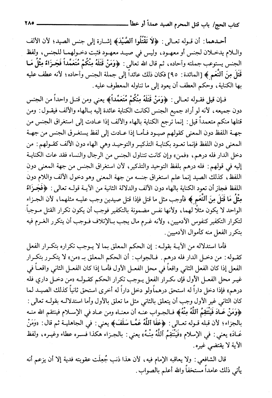 فَإِنْ قِيلَ فَقَوْلُهُ تَعَالَى: {وَمَنْ قَتَلَهُ مِنْكُمْ مُتَعَمِّداً} يَعْنِي وَمَنْ قَتَلَ وَاحِدًا مِنَ الْجِنْسِ دُونَ جَمِيعِهِ، لِأَنَّهُ لَوْ أَرَادَ جَمِيعَ الْجِنْسِ لَكَانَتِ الْكِنَايَةُ عَائِدَةً إِلَيْهِ بِالْهَاءِ وَالْأَلِفِ فَيَقُولُ: وَمَنْ قَتَلَهَا مِنْكُمْ مُتَعَمَّدًا قِيلَ: إِنَّمَا تَرْجِعُ الْكِنَايَةُ بِالْهَاءِ وَالْأَلِفِ إِذَا عَادَتْ إِلَى اسْتِغْرَاقِ الْجِنْسِ مِنْ جِهَةِ اللَّفْظِ دُونَ الْمَعْنَى كَقَوْلِهِمْ صُيُودٌ فَأَمَّا إِذَا عَادَتْ إِلَى لَفْظٍ يَسْتَغْرِقُ الْجِنْسَ مِنْ جِهَةِ الْمَعْنَى دُونَ اللَّفْظِ فَإِنَّمَا تَعُودُ بِكِنَايَةِ التَّذْكِيرِ وَالتَّوْحِيدِ وَهِيَ الْهَاءُ دُونَ الْأَلِفِ كَقَوْلِهِمْ: مَنْ دَخَلَ الدَّارَ فَلَهُ دِرْهَمٌ، " فَمَنْ " وَإِنْ كَانَتْ تَتَنَاوَلُ الْجِنْسَ مِنَ الرِّجَالِ وَالنِّسَاءِ فقد عادت الكناية إليه في قولهم: فَلَهُ دِرْهَمٌ بِلَفْظِ التَّوْحِيدِ وَالتَّذْكِيرِ، لِأَنَّ اسْتِغْرَاقَ الْجِنْسِ مِنْ جِهَةِ الْمَعْنَى دُونَ اللَّفْظِ، كَذَلِكَ الصَّيْدُ إِنَّمَا عُلِمَ اسْتِغْرَاقُ جِنْسِهِ مِنْ جِهَةِ الْمَعْنَى وَهُوَ دُخُولُ الْأَلِفِ وَاللَّامِ دُونَ اللَّفْظِ فَجَازَ أَنْ تَعُودَ الْكِنَايَةُ بِالْهَاءِ دُونَ الْأَلِفِ وَالدَّلَالَةُ الثَّانِيَةُ مِنَ الْآيَةِ قَوْله تَعَالَى: {فَجَزَاءُ مِثْلُ مَا قَتَلَ مِنَ النَّعَمِ} فَأَوْجَبَ مِثْلَ مَا قَتَلَ فَإِذَا قَتَلَ صَيْدَيْنِ وَجَبَ عَلَيْهِ مِثْلُهُمَا، لِأَنَّ الْجَزَاءَ الْوَاحِدَ لَا يَكُونُ مِثْلًا لَهُمَا، وَلِأَنَّهَا نَفْسٌ مَضْمُونَةٌ بِالتَّكْفِيرِ فَوَجَبَ أَنْ يَكُونَ تَكْرَارُ الْقَتْلِ مُوجِبًا لِتَكْرَارِ التَّكْفِيرِ كَنُفُوسِ الْآدَمِيِّينَ، وَلِأَنَّهُ غُرْمُ مَالٍ يَجِبُ بِالْإِتْلَافِ فَوَجَبَ أَنْ يَتَكَرَّرَ الْغُرْمُ فِيهِ بِتَكَرُّرِ الْفِعْلِ مِنْهُ كَأَمْوَالِ الْآدَمِيِّينَ.