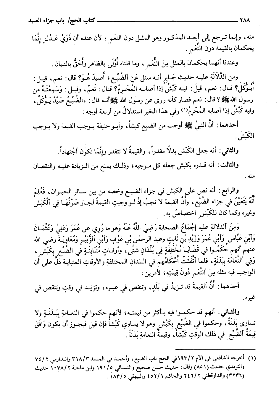 وَالرَّابِعُ: أَنَّهُ نَصَّ عَلَى الْكَبْشِ فِي جَزَاءِ الضَّبُعِ وَخَصَّهُ مِنْ بَيْنِ سَائِرِ الْحَيَوَانِ، فَعُلِمَ أَنَّهُ يَتَعَيَّنُ فِي جَزَاءِ الضَّبُعِ، وَأَنَّ الْقِيمَةَ لَا تَجِبُ إِذْ لَوْ وَجَبَتِ القيمة لجاز صرفها في الكبش وغيره وكما كَانَ لِلْكَبْشِ اخْتِصَاصٌ بِهِ.