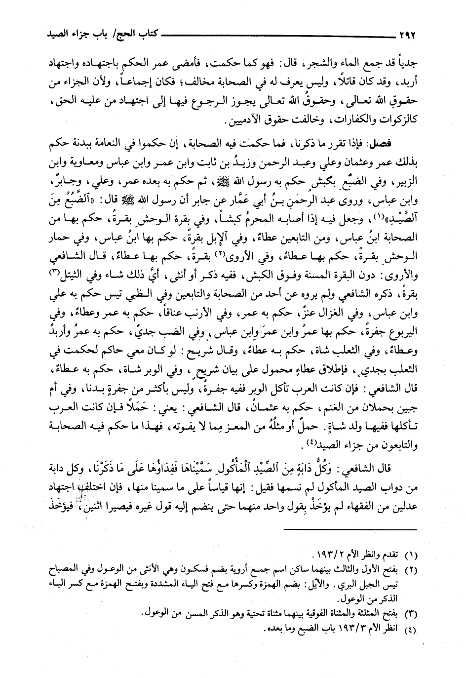 قَالَ الشَّافِعِيُّ: وَكُلٌّ دابةٍ مِنَ الْصَيْدِ الْمَأْكُولِ سَّمَيْنَاهَا فَفِدَاؤُهَا عَلَى مَا ذَكَرْنَا، وَكُلُّ دَابَّةٍ مِنْ دَوَابِّ الصَّيْدِ الْمَأْكُولِ لَمْ نُسَمِّهَا فَقِيلَ: إِنَّهَا قياساً عَلَى مَا سَمَّيْنَا مِنْهَا، فَإِنِ اخْتَلَفَ اجْتِهَادِ عَدْلَيْنِ مِنَ الْفُقَهَاءِ لَمْ يُؤْخَذْ بِقَوْلٍ وَاحِدٍ مِنْهُمَا حَتَّى يَنْضَمَّ إِلَيْهِ قَوْلُ غَيْرِهِ فَيَصِيرَا اثنين، فيؤخذ