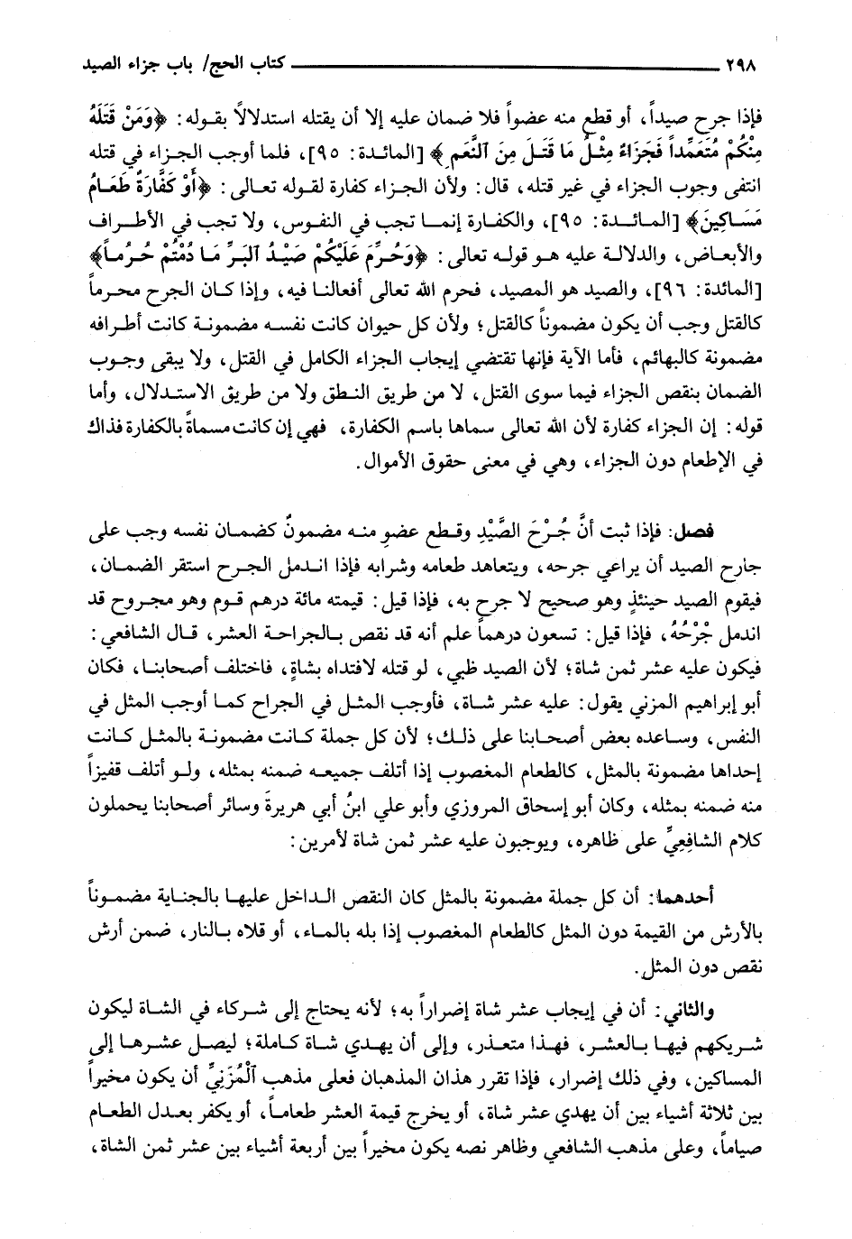 فَإِذَا جَرَحَ صَيْدًا، أَوْ قَطَعَ مِنْهُ عُضْوًا فَلَا ضَمَانَ عَلَيْهِ إِلَّا أَنْ يَقْتُلَهُ اسْتِدْلَالًا بِقَوْلِهِ: {وَمَنْ قَتَلَهُ مِنْكُمْ مُتَعَمِّداً فَجَزاءٌ مِثْلَ مَا قَتَلَ مِنَ النَّعَمِ) {المائدة: 95) ، فَلَمَّا أَوْجَبَ الْجَزَاءَ فِي قَتْلِهِ انْتَفَى وُجُوبُ الْجَزَاءِ فِي غَيْرِ قَتْلِهِ، قَالَ: وَلِأَنَّ الْجَزَاءَ كَفَّارَةٌ لِقَوْلِهِ تَعَالَى: {أَوْ كَفَّارَةٌ طَعَامُ مَسَاكِينَ) {المائدة: 95) ، وَالْكَفَّارَةُ إِنَّمَا تَجِبُ فِي النُّفُوسِ، وَلَا تَجِبُ فِي الْأَطْرَافِ وَالْأَبْعَاضِ، وَالدَّلَالَةُ عَلَيْهِ هُوَ قَوْله تَعَالَى: {وَحَرَّمَ عَلَيْكُمْ صَيْدُ البَرِّ مَا دُمْتُمْ حُرُماً} (المائدة: 96) ، وَالصَّيْدُ هُوَ الْمَصِيدُ، فَحَرَّمَ اللَّهُ تَعَالَى أَفْعَالَنَا فِيهِ، وَإِذَا كَانَ الْجُرْحُ مُحَرَّمًا كَالْقَتْلِ وَجَبَ أَنْ يَكُونَ مَضْمُونًا كَالْقَتْلِ؛ وَلِأَنَّ كُلَّ حَيَوَانٍ كَانَتْ نَفْسُهُ مَضْمُونَةً كَانَتْ أَطْرَافُهُ مَضْمُونَةً كَالْبَهَائِمِ، فَأَمَّا الْآيَةُ فَإِنَّهَا تَقْتَضِي إِيجَابَ الْجَزَاءِ الْكَامِلِ فِي الْقَتْلِ، وَلَا يَبْقَى وُجُوبُ الضَّمَانِ بِنَقْصِ الْجَزَاءِ فِيمَا سِوَى الْقَتْلِ، لَا مِنْ طَرِيقِ النُّطْقِ وَلَا مِنْ طَرِيقِ الِاسْتِدْلَالِ، وَأَمَّا قَوْلُهُ: إِنَّ الْجَزَاءَ كَفَّارَةٌ لِأَنَّ اللَّهَ تَعَالَى سَمَّاهَا بِاسْمِ الْكَفَّارَةِ، فَهِيَ إِنْ كَانَتْ مُسَمَّاةً بِالْكَفَّارَةِ فَذَاكَ فِي الْإِطْعَامِ دُونَ الْجَزَاءِ، وَهِيَ فِي مَعْنَى حُقُوقِ الْأَمْوَالِ.