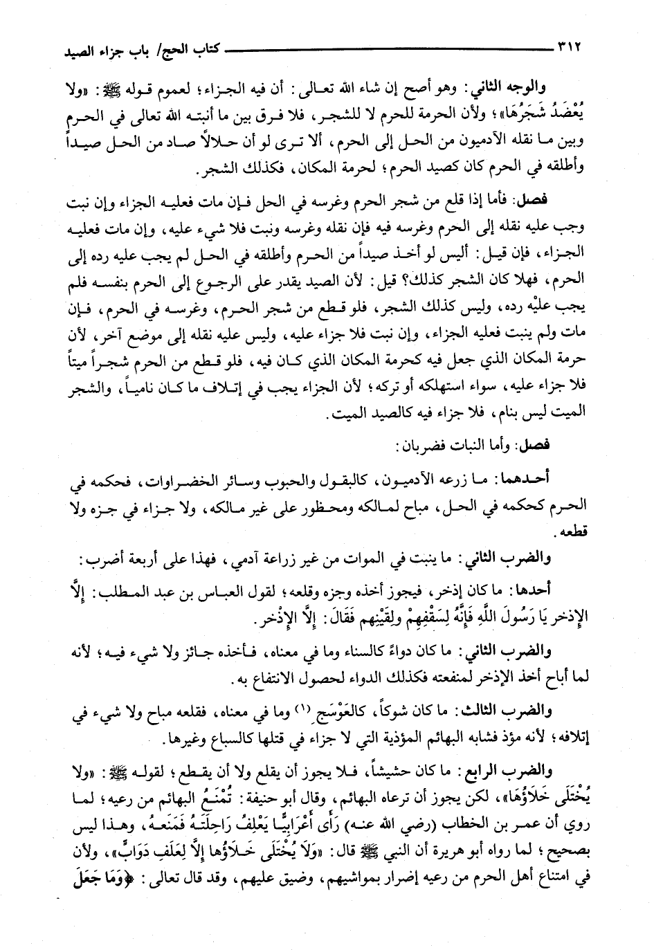 وَالضَّرْبُ الرَّابِعُ: مَا كَانَ حَشِيشًا، فَلَا يَجُوزُ أَنْ يُقْلَعَ وَلَا أَنْ يُقْطَعَ؛ لِقَوْلِهِ - صَلَّى اللَّهُ عَلَيْهِ وَسَلَّم َ -: " وَلَا يُخْتَلَى خَلَاؤُهَا) ، لَكِنْ يَجُوزُ أَنْ تَرْعَاهُ الْبَهَائِمُ، وَقَالَ أبو حنيفة: تُمْنَعُ الْبَهَائِمُ مِنْ رَعْيِهِ؛ لِمَا رُوِيَ أَنَّ عُمَرَ بْنَ الْخَطَّابِ (رَضِيَ اللَّهُ عَنْهُ) رَأَى أَعْرَابِيًّا يَعْلِفُ رَاحِلَتَهُ فَمَنَعَهُ، وَهَذَا لَيْسَ بِصَحِيحٍ؛ لِمَا رَوَاهُ أَبُو هُرَيْرَةَ أَنَّ النَّبِيَّ - صَلَّى اللَّهُ عَلَيْهِ وَسَلَّم َ - قَالَ: " وَلَا يُخْتَلَى خَلَاؤُهَا إِلَّا لِعَلْفِ دَوَابَّ " وَلِأَنَّ فِي امْتِنَاعِ أَهْلِ الْحَرَمِ مِنْ رَعْيِهِ إضرار بمواشيهم، وضيق عليهم، وقد قَالَ تَعَالَى: {وَمَا جَعَلَ