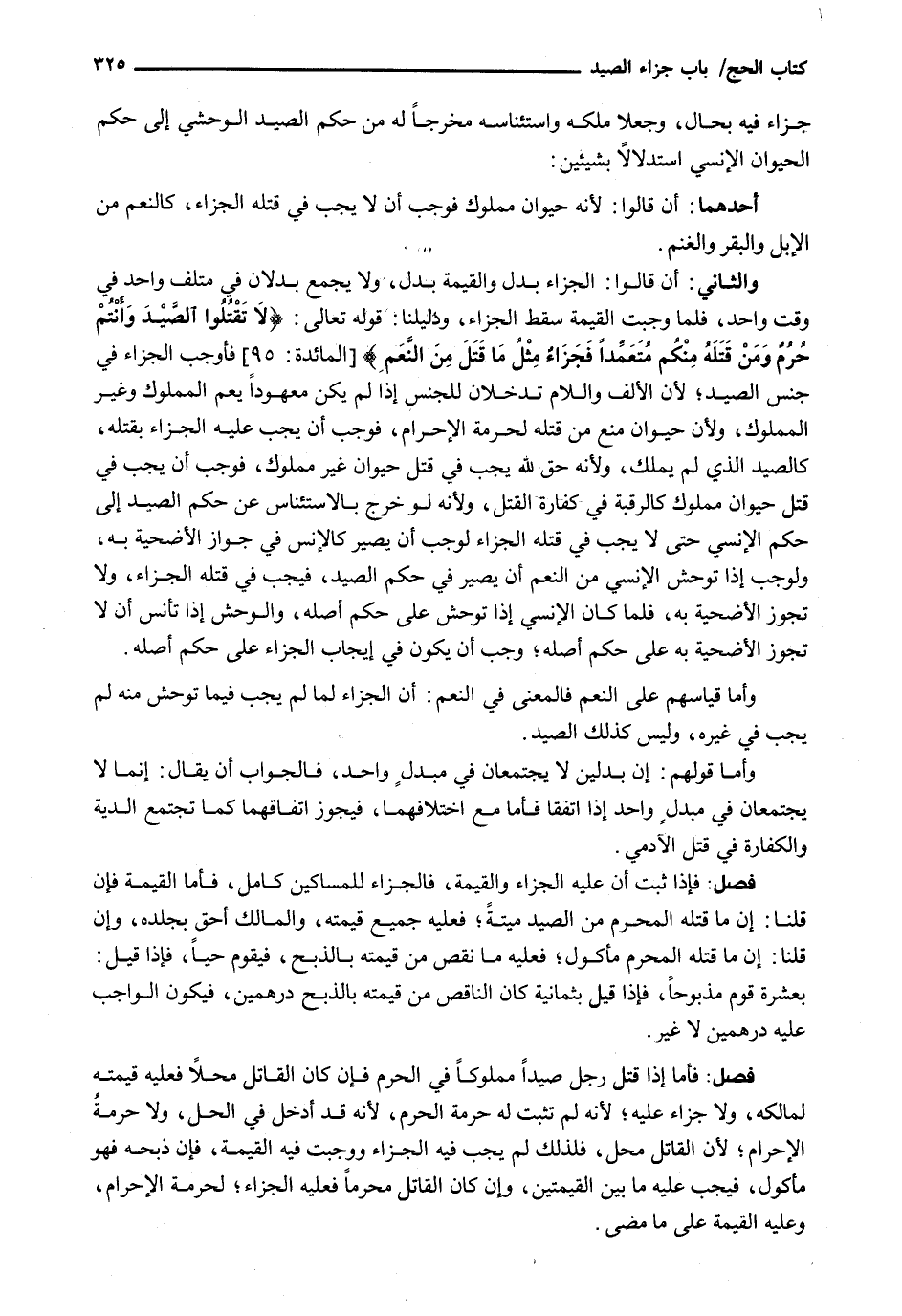 وَالثَّانِي: أَنْ قَالُوا: الْجَزَاءُ بَدَلٌ وَالْقِيمَةُ بَدَلٌ، وَلَا يُجْمَعُ بَدَلَانِ فِي مُتْلَفٍ وَاحِدٍ فِي وَقْتٍ وَاحِدٍ، فَلَمَّا وَجَبَتِ الْقِيمَةُ سَقَطَ الْجَزَاءُ، وَدَلِيلُنَا: قَوْله تَعَالَى: {لاَ تَقْتُلُوا الصَّيْدَ وَأَنْتُمْ حُرُمٌ وَمَنْ قَتَلَهُ مِنْكُمْ مُتَعَمِّداً فَجَزَاءٌ مِثْلَ مَا قَتَلَ مِنَ النَّعَمِ) {المائدة: 95) فَأَوْجَبَ الْجَزَاءَ فِي جِنْسِ الصَّيْدِ؛ لِأَنَّ الْأَلِفَ وَاللَّامَ تَدْخُلَانِ لِلْجِنْسِ إِذَا لَمْ يَكُنْ مَعْهُودًا يَعُمُّ المملوك وغير المملوك، ولأن حَيَوَانٌ مُنِعَ مِنْ قَتْلِهِ لِحُرْمَةِ الْإِحْرَامِ، فَوَجَبَ أَنْ يَجِبَ عَلَيْهِ الْجَزَاءُ بِقَتْلِهِ، كَالصَّيْدِ الَّذِي لم يملك، ولأنه حق الله يَجِبُ فِي قَتْلِ حَيَوَانٍ غَيْرِ مَمْلُوكٍ، فَوَجَبَ أَنْ يَجِبَ فِي قَتْلِ حَيَوَانٍ مَمْلُوكٍ كَالرَّقَبَةِ فِي كَفَّارَةِ الْقَتْلِ، وَلِأَنَّهُ لَوْ خَرَجَ بِالِاسْتِئْنَاسِ عَنْ حُكْمِ الصَّيْدِ إِلَى حُكْمِ الْإِنْسِيِّ حَتَّى لَا يَجِبَ فِي قَتْلِهِ الْجَزَاءُ لَوَجَبَ أَنْ يصير كالإنس فِي جَوَازِ الْأُضْحِيَةِ بِهِ، وَلَوَجَبَ إِذَا تَوَحَّشَ الْإِنْسِيُّ مِنَ النَّعَمِ أَنْ يَصِيرَ فِي حُكْمِ الصَّيْدِ، فَيَجِبَ فِي قَتْلِهِ الْجَزَاءُ، وَلَا تَجُوزُ الْأُضْحِيَةُ بِهِ، فَلَمَّا كَانَ الْإِنْسِيُّ إِذَا تَوَحَّشَ عَلَى حُكْمِ أَصْلِهِ، وَالْوَحْشُ إِذَا تَأَنَّسَ أَنْ لَا تَجُوزَ الْأُضْحِيَةُ بِهِ عَلَى حُكْمِ أَصْلِهِ؛ وَجَبَ أَنْ يَكُونَ فِي إِيجَابِ الْجَزَاءِ عَلَى حُكْمِ أَصْلِهِ.