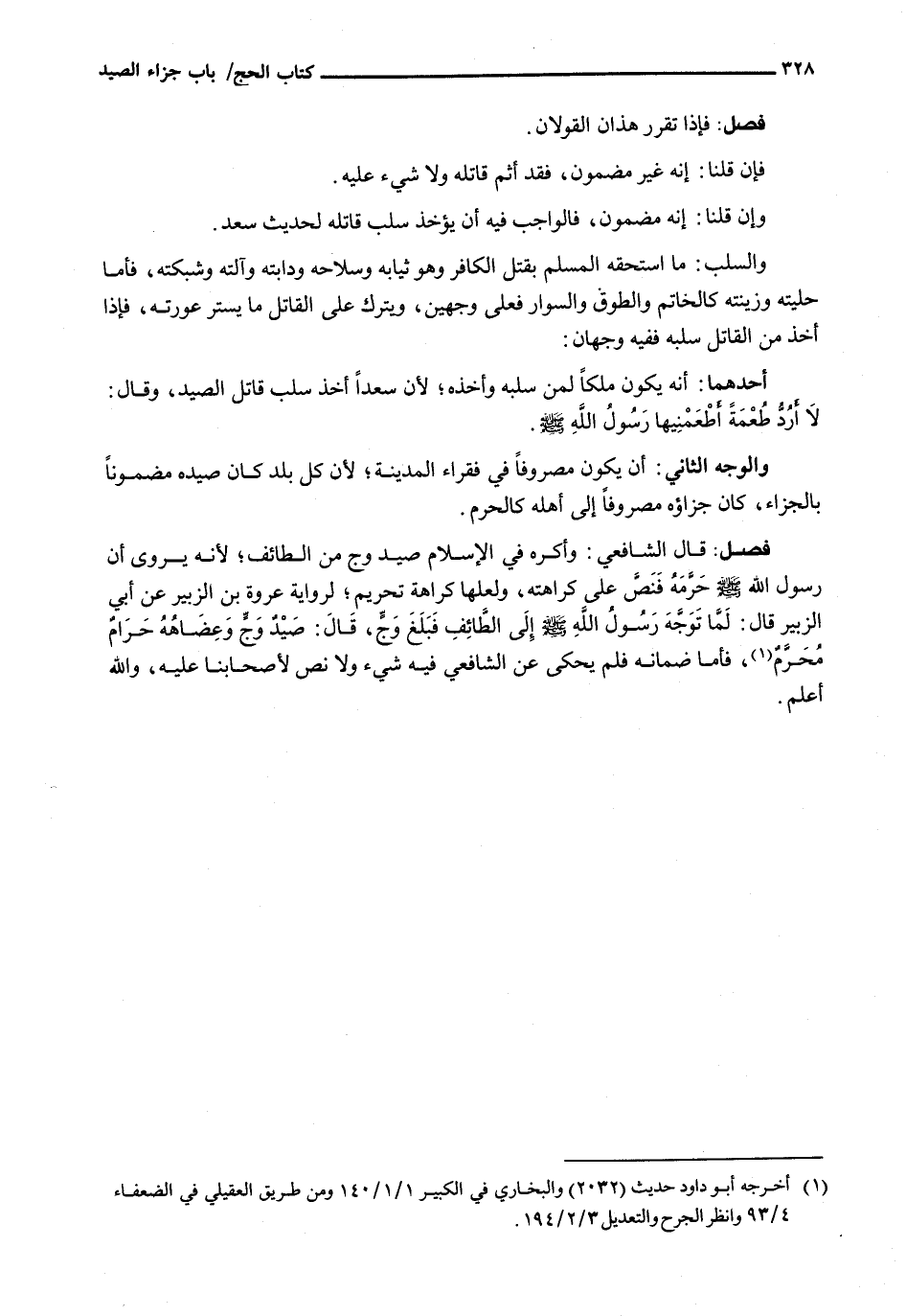 : قَالَ الشَّافِعِيُّ: وَأَكْرَهُ فِي الْإِسْلَامِ صَيْدَ وج من الطائف؛ لأنه يَرْوِي أَنَّ رَسُولَ اللَّهِ - صَلَّى اللَّهُ عَلَيْهِ وَسَلَّم َ - حَرَّمَهُ فَنَصَّ عَلَى كَرَاهَتِهِ، وَلَعَلَّهَا كَرَاهَةُ تَحْرِيمٍ؛ لرواية عروة بن الزبير عن أبي الزبير قَالَ: لَمَّا تَوَجَّهَ رَسُولُ اللَّهِ - صَلَّى اللَّهُ عَلَيْهِ وَسَلَّم َ - إلى الطائف فبلغ وج، قَالَ: صَيْدُ وَجٍّ وَعِضَاهُهُ حرامٌ محرمٌ، فَأَمَّا ضمانه فلم يحكى عَنِ الشَّافِعِيِّ فِيهِ شَيْءٌ وَلَا نَصَّ لِأَصْحَابِنَا عليه، والله أعلم.