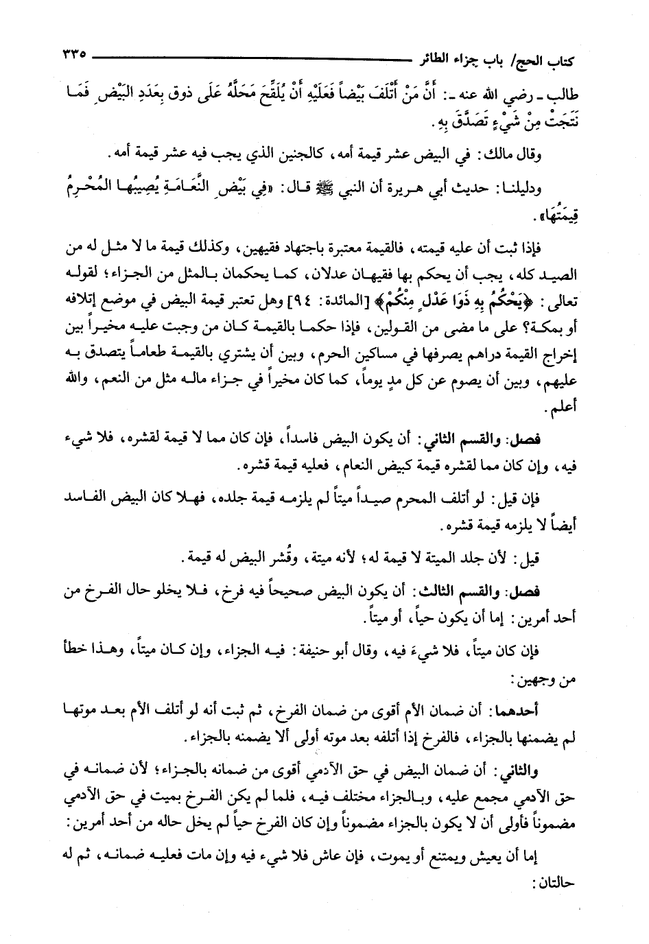 فَإِذَا ثَبَتَ أَنَّ عَلَيْهِ قِيمَتَهُ، فَالْقِيمَةُ مُعْتَبِرَةٌ بِاجْتِهَادِ فَقِيهَيْنِ، وَكَذَلِكَ قِيمَةُ مَا لَا مِثْلَ لَهُ مِنَ الصَّيْدِ كُلِّهِ، يَجِبُ أَنْ يَحْكُمَ بِهَا فَقِيهَانِ عَدْلَانِ، كَمَا يَحْكُمَانِ بِالْمِثْلِ مِنَ الْجَزَاءِ؛ لِقَوْلِهِ تَعَالَى: {يَحْكُمُ بِهِ ذَوَا عَدْلٍ مِنْكُمْ) {المائدة: 94) وَهَلْ تُعْتَبَرُ قِيمَةُ الْبَيْضِ فِي مَوْضِعِ إِتْلَافِهِ أَوْ بِمَكَّةَ؟ عَلَى مَا مَضَى مِنَ الْقَوْلَيْنِ، فَإِذَا حَكَمَا بِالْقِيمَةِ كَانَ مَنْ وَجَبَتْ عَلَيْهِ مُخَيَّرًا بَيْنَ إِخْرَاجِ الْقِيمَةِ دَرَاهِمَ يَصْرِفُهَا فِي مَسَاكِينِ الْحَرَمِ، وَبَيْنَ أَنْ يَشْتَرِيَ بِالْقِيمَةِ طَعَامًا يَتَصَدَّقُ بِهِ عَلَيْهِمْ، وَبَيْنَ أَنْ يَصُومَ عَنْ كُلِّ مدٍ يَوْمًا، كَمَا كَانَ مخيراً في جزاء ماله مِثْلٌ مِنَ النَّعَمِ، وَاللَّهُ أَعْلَمُ.