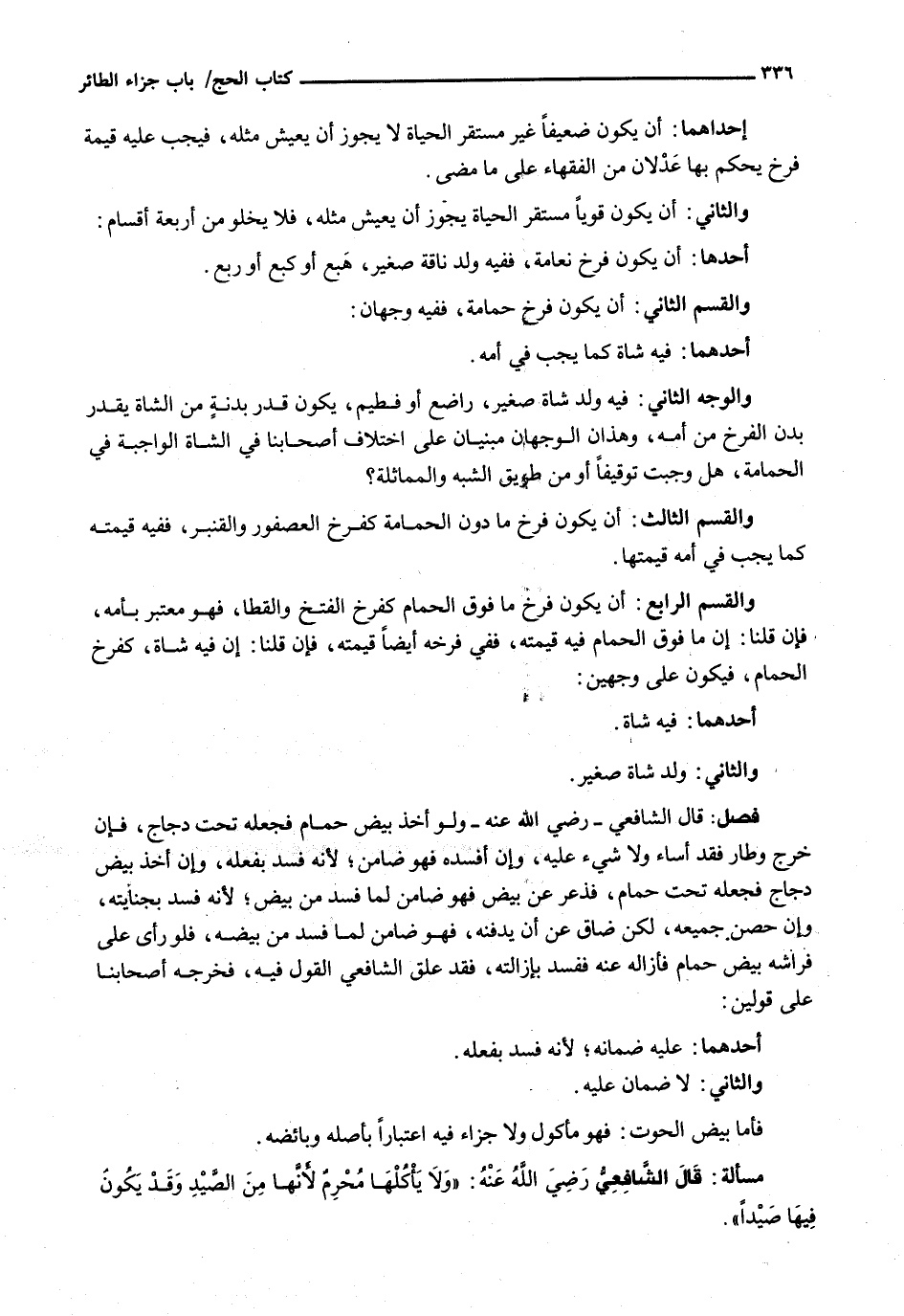 وَالْقِسْمُ الرَّابِعُ: أَنْ يَكُونَ فَرْخَ مَا فَوْقَ الْحَمَامِ كَفَرْخِ الْفَتَخِ وَالْقَطَا، فَهُوَ مُعْتَبِرٌ بِأُمِّهِ، فَإِنْ قُلْنَا: إِنَّ مَا فَوْقَ الْحَمَامِ فِيهِ قِيمَتُهُ، فَفِي فَرْخِهِ أَيْضًا قِيمَتُهُ، فَإِنْ قُلْنَا: إِنَّ فِيهِ شَاةً، كَفَرْخِ الْحَمَامِ، فَيَكُونُ عَلَى وَجْهَيْنِ: