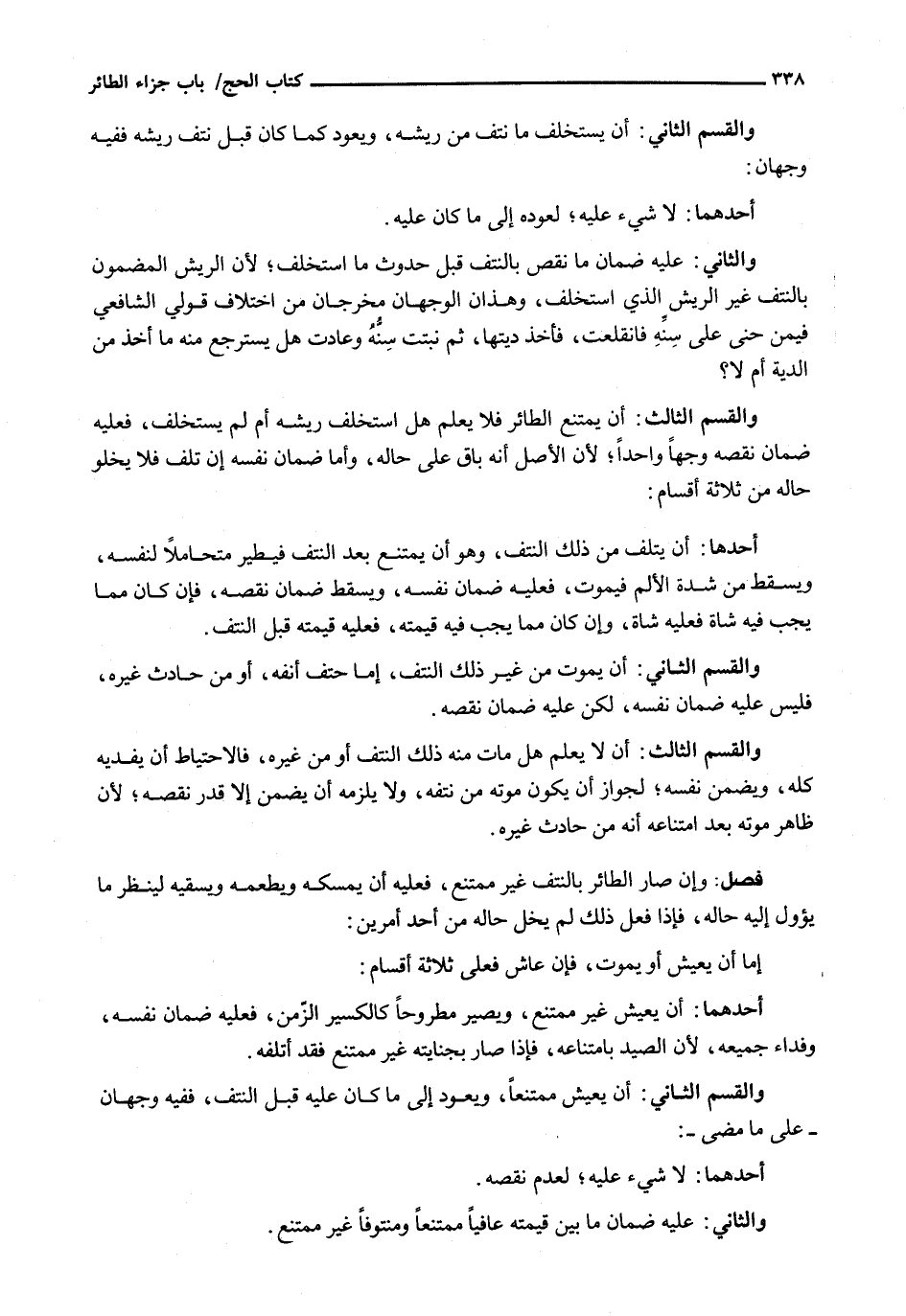 وَالْقِسْمُ الثَّانِي: أَنْ يَسْتَخْلِفَ مَا نُتِفَ مِنْ رِيشِهِ، وَيَعُودَ كَمَا كَانَ قَبْلَ نَتْفِ رِيشِهِ فَفِيهِ وَجْهَانِ:
