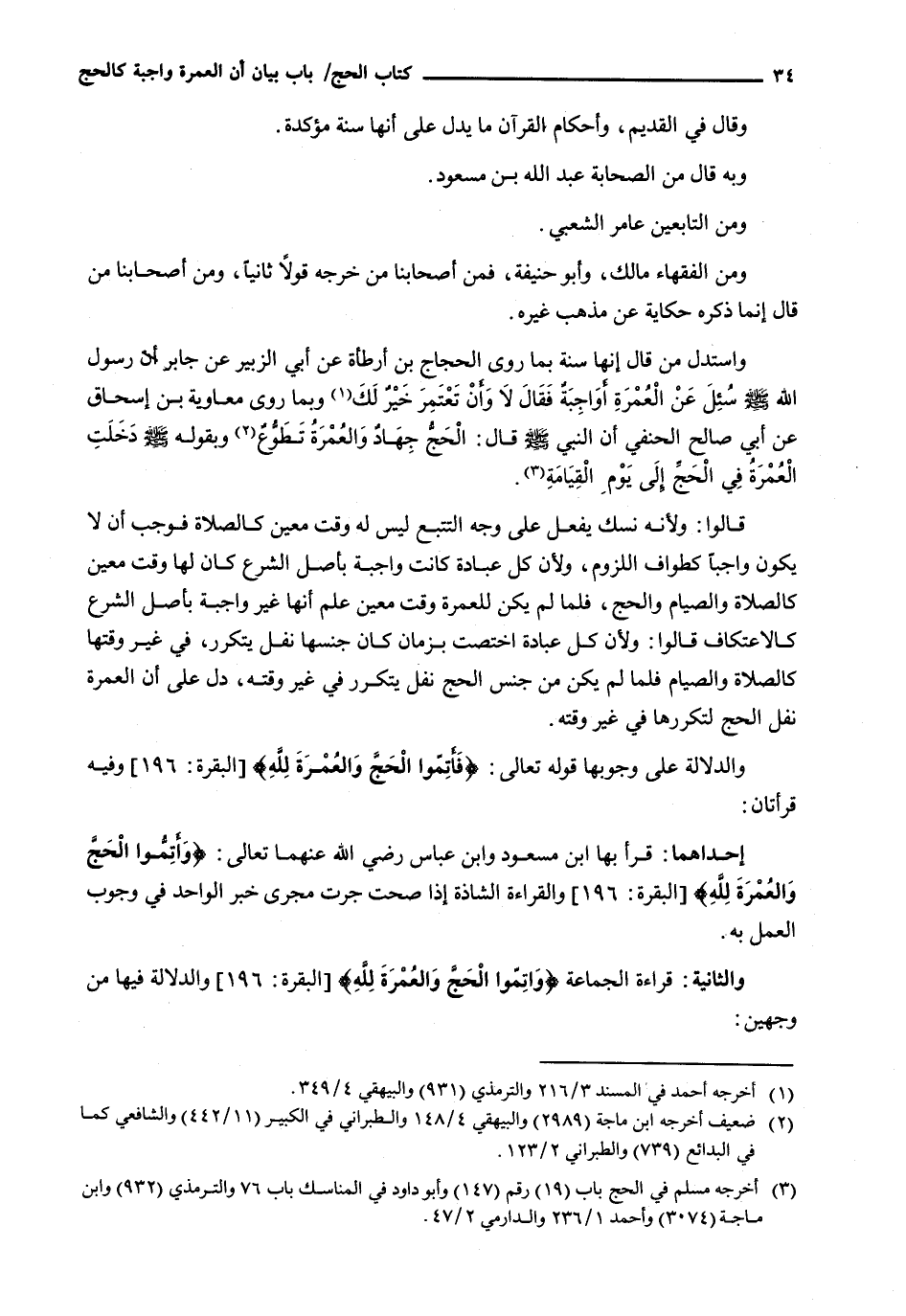 وَالدَّلَالَةُ عَلَى وجوبها قوله تعالى: {فَأَتِمّوا الحَجَّ وَالعُمْرَةَ للهِ) {البقرة: 196) وفيه قرأتان: