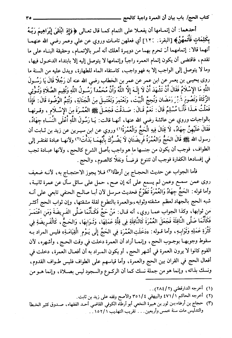 فَأَمَّا الْجَوَابُ عَنْ حَدِيثِ الْحَجَّاجِ بْنِ أَرْطَأَةَ فَلَا يَجُوزُ الِاحْتِجَاجُ بِهِ، لِأَنَّهُ ضَعِيفٌ رُوِيَ عَمَّنْ سَمِعَ وَعَمَّنْ لَمْ يَسْمَعْ عَلَى أَنَّهُ إِنْ صَحَّ، حُمِلَ عَلَى سَائِلٍ سَأَلَ عَنْ عُمْرَةٍ ثَانِيَةٍ، وَأَمَّا قَوْلُهُ: الْحَجُّ جهادٌ وَالْعُمْرَةُ تَطَوُّعٌ فَحَدِيثٌ مُرْسَلٌ لِأَنَّ أَبَا صَالِحٍ الْحَنَفِيَّ تَابِعِيٌّ عَلَى أَنَّهُ شَبَّهَ الْحَجَّ بِالْجِهَادِ لِعِظَمِ مَشَقَّتِهِ وَثَوَابِهِ، وَالْعُمْرَةَ بِالتَّطَوُّعِ لِقِلَّةِ مَشَقَّتِهَا، وَإِنَّ ثَوَابَ الْحَجِّ أَكْثَرُ مِنْ ثَوَابِهَا، وَكَذَا الْجَوَابُ عَمَّا رُوِيَ، أَنَّهُ قَالَ: مَنْ حَجَّ فَكَأَنَّمَا صَلَّى الْفَرِيضَةَ وَمَنِ اعْتَمَرَ فَكَأَنَّمَا صَلَّى النَّافِلَةَ فَجَعَلَ الْعُمْرَةَ كَالنَّافِلَةِ فِي قِلَّةِ عَمَلِهَا، وَثَوَابِهَا، وَالْحَجَّ، كَالْفَرِيضَةِ فِي كَثْرَةِ عَمَلِهِ وَثَوَابِهِ، وَأَمَّا قَوْلُهُ: " دَخَلَتِ الْعُمْرَةُ فِي الْحَجَّ إِلَى يَوْمِ الْقِيَامَةِ " فَلَيْسَ الْمُرَادُ بِهِ سُقُوطُ وُجُوبِهَا بِوُجُوبِ الْحَجِّ، وَإِنَّمَا أَرَادَ أَنَّ الْعُمْرَةَ دَخَلَتْ فِي وَقْتِ الْحَجِّ، وَأَشْهُرِهِ، لِأَنَّ الْقَوْمَ كَانُوا لَا يَرَوْنَ الْعُمْرَةَ فِي أَشْهُرِ الْحَجِّ، أَوْ يَكُونُ الْمُرَادُ بِهِ أَنَّ أَفْعَالَ الْعُمْرَةِ، دَخَلَتْ فِي أَفْعَالِ الْحَجِّ فِي الْقِرَانِ بَيْنَ الْحَجِّ وَالْعُمْرَةِ، وَأَمَّا قِيَاسُهُمْ عَلَى الطَّوَافِ فَلَيْسَ طواف القدوم، ونسك بِذَاتِهِ، وَإِنَّمَا هُوَ مِنْ جُمْلَةِ نُسُكٍ كَمَا أَنَّ الرُّكُوعَ وَالسُّجُودَ لَيْسَ بِصَلَاةٍ، وَإِنَّمَا هُوَ من