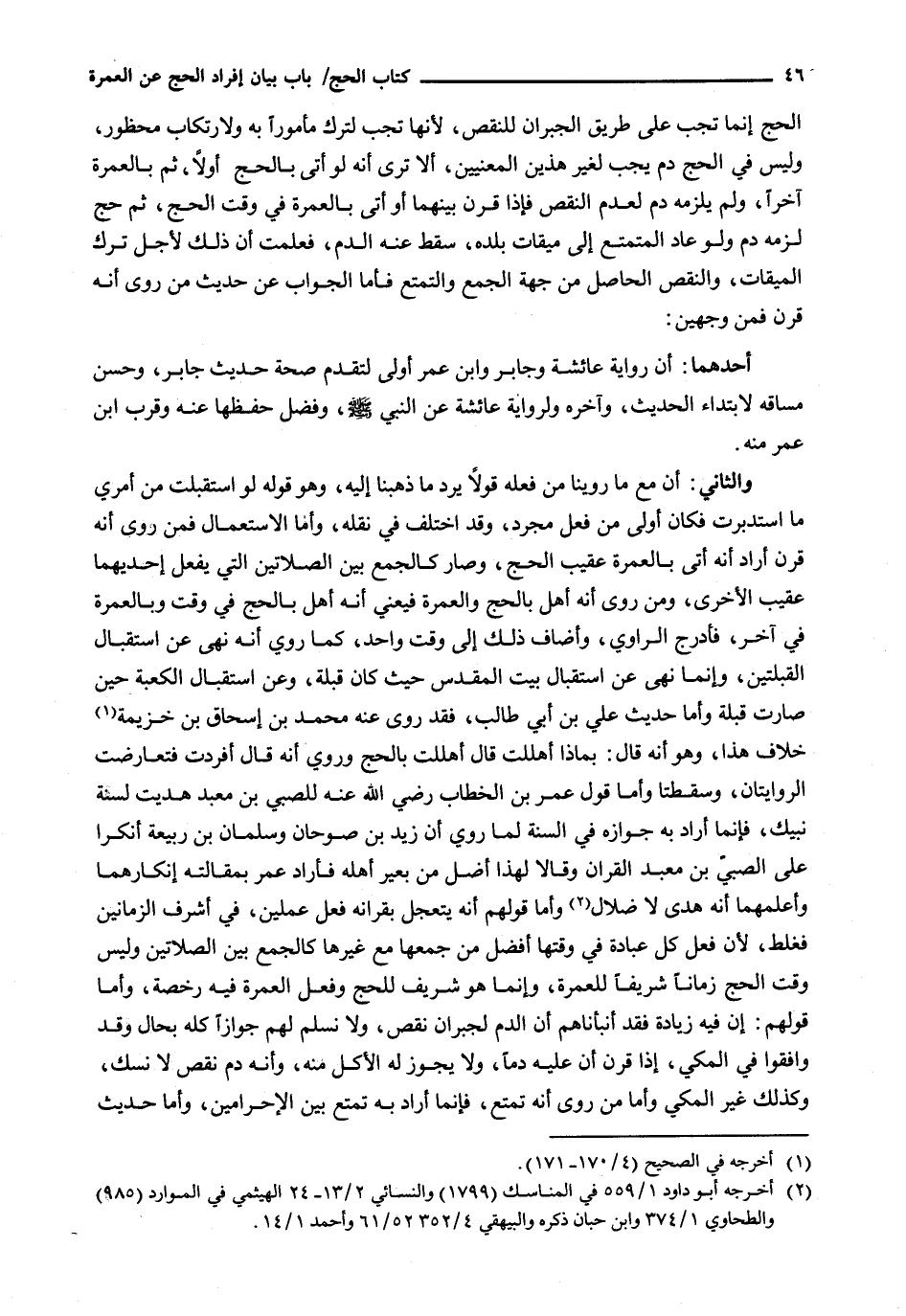 أَحَدُهُمَا: أَنَّ رِوَايَةَ عَائِشَةَ وَجَابِرٍ وَابْنِ عُمَرَ أُولَى لِتَقَدُّمِ صِحَّةِ حَدِيثِ جَابِرٍ، وَحُسْنِ مَسَاقِهِ لِابْتِدَاءِ الْحَدِيثِ، وَآخِرِهِ وَلِرِوَايَةِ عَائِشَةَ عَنِ النَّبِيِّ - صَلَّى اللَّهُ عَلَيْهِ وَسَلَّم َ -، وَفَضْلِ حِفْظِهَا عَنْهُ وَقُرْبِ ابْنِ عُمَرَ مِنْهُ.