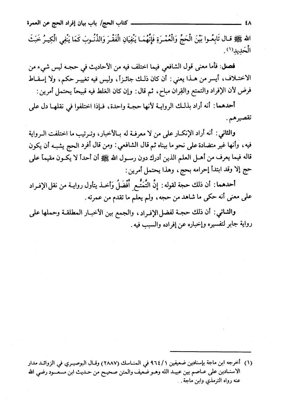 وَالثَّانِي: أَنَّ ذَلِكَ حُجَّةٌ لِفَضْلِ الْإِفْرَادِ، وَالْجَمْعِ بَيْنَ الْأَخْبَارِ الْمُطْلَقَةِ وَحَمْلِهَا عَلَى رِوَايَةِ جَابِرٍ لِتَفْسِيرِهِ وَإِخْبَارِهِ عَنْ إِفْرَادِهِ وَالسَّبَبِ فِيهِ.