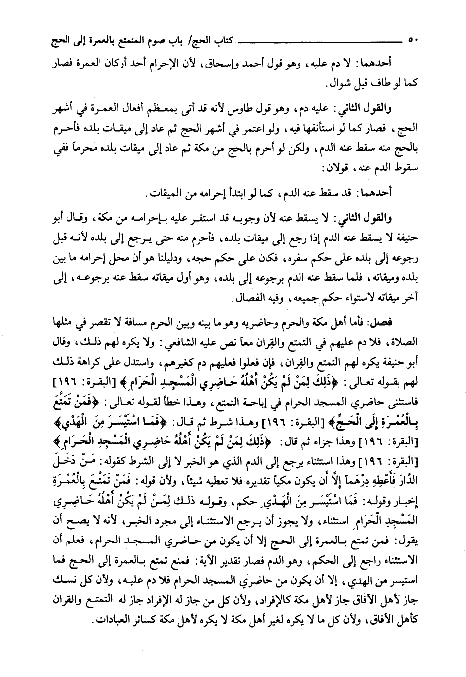 : فَأَمَّا أَهْلُ مَكَّةَ وَالْحَرَمِ وَحَاضِرِيهِ وَهُوَ مَا بَيْنَهُ وَبَيْنَ الْحَرَمِ مَسَافَةٌ لَا تُقْصَرُ فِي مِثْلِهَا الصَّلَاةُ، فَلَا دَمَ عَلَيْهِمْ فِي التَّمَتُّعِ وَالْقِرَانِ مَعًا نَصَّ عَلَيْهِ الشَّافِعِيُّ: وَلَا يُكْرَهُ لَهُمْ ذَلِكَ، وَقَالَ أبو حنيفة يُكْرَهُ لَهُمُ التَّمَتُّعُ والقِران، فَإِنْ فَعَلُوا فَعَلَيْهِمْ دَمٌ كَغَيْرِهِمْ، وَاسْتَدَلَّ عَلَى كَرَاهَةِ ذَلِكَ لَهُمْ بِقَوْلِهِ تَعَالَى: {ذَلِكَ لِمَنْ لَمْ يَكُنْ أهْلُهُ حَاضِرِي المَسْجِدِ الْحَرَامِ) {البقرة: 196) فَاسْتَثْنَى حَاضِرِي الْمَسْجِدِ الْحَرَامِ فِي إِبَاحَةِ التَّمَتُّعِ، وَهَذَا خَطَأٌ لِقَوْلِهِ تَعَالَى: {فَمَنْ تَمَتَعَ بِالْعُمْرَةِ إِلَى الْحَجِّ) {البقرة: 196) وَهَذَا شَرْطٌ ثُمَّ قَالَ: {فَمَا اسْتَيْسَرَ مِنَ الهَدْيِ} (البقرة: 196) وَهَذَا جَزَاءٌ ثُمَّ قَالَ: {ذَلِكَ لِمْنْ لَمْ يَكُنْ أهْلُهُ حَاضِرِي الْمَسْجِدِ الْحَرَامِ) (البقرة: 196) وَهَذَا اسْتِثْنَاءٌ يَرْجِعُ إِلَى الدَّمِ الَّذِي هُوَ الْخَبَرُ لَا إِلَى الشَّرْطِ كَقَوْلِهِ: مَنْ دَخَلَ الدَّارَ فَأَعْطِهِ دِرْهَمًا إِلَّا أن يكون مكياً تقديره فلا تعطيه شيئاً، ولأن قوله: فمن تمتع بالعمرة إخبار وقوله: فما استيسر من الهدي حُكْمٌ، وَقَوْلُهُ ذَلِكَ لِمَنْ لَمْ يَكُنْ أَهْلُهُ حاضري المسجد الحرام اسْتِثْنَاءٌ، وَلَا يَجُوزُ أَنْ يَرْجِعَ الِاسْتِثْنَاءُ إِلَى مُجَرَّدِ الْخَبَرِ، لِأَنَّهُ لَا يَصِحُّ أَنْ يَقُولَ: فَمَنْ تَمَتَّعَ بِالْعُمْرَةِ إِلَى الْحَجِّ إِلَّا أَنْ يَكُونَ مِنْ حَاضِرِي الْمَسْجِدِ الْحَرَامِ، فَعُلِمَ أَنَّ الِاسْتِثْنَاءَ رَاجِعٌ إِلَى الْحُكْمِ، وَهُوَ الدَّمُ فَصَارَ تقدير الآية: فمنع تَمَتَّعَ بِالْعُمْرَةِ إِلَى الْحَجِّ فَمَا اسْتَيْسَرَ مِنَ الْهَدْيِ، إِلَّا أَنْ يَكُونَ مِنْ حَاضِرِي الْمَسْجِدِ الْحَرَامِ فَلَا دَمَ عَلَيْهِ، وَلِأَنَّ كُلَّ نُسُكٍ جَازَ لِأَهْلِ الْآفَاقِ جَازَ لِأَهْلِ مَكَّةَ كَالْإِفْرَادِ، وَلِأَنَّ كُلَّ مَنْ جَازَ لَهُ الْإِفْرَادُ جَازَ لَهُ التَّمَتُّعُ وَالْقِرَانُ كَأَهْلِ الْآفَاقِ، وَلِأَنَّ كُلَّ مَا لَا يُكْرَهُ لِغَيْرِ أَهْلِ مَكَّةَ لَا يُكْرَهُ لِأَهْلِ مَكَّةَ كَسَائِرِ الْعِبَادَاتِ.