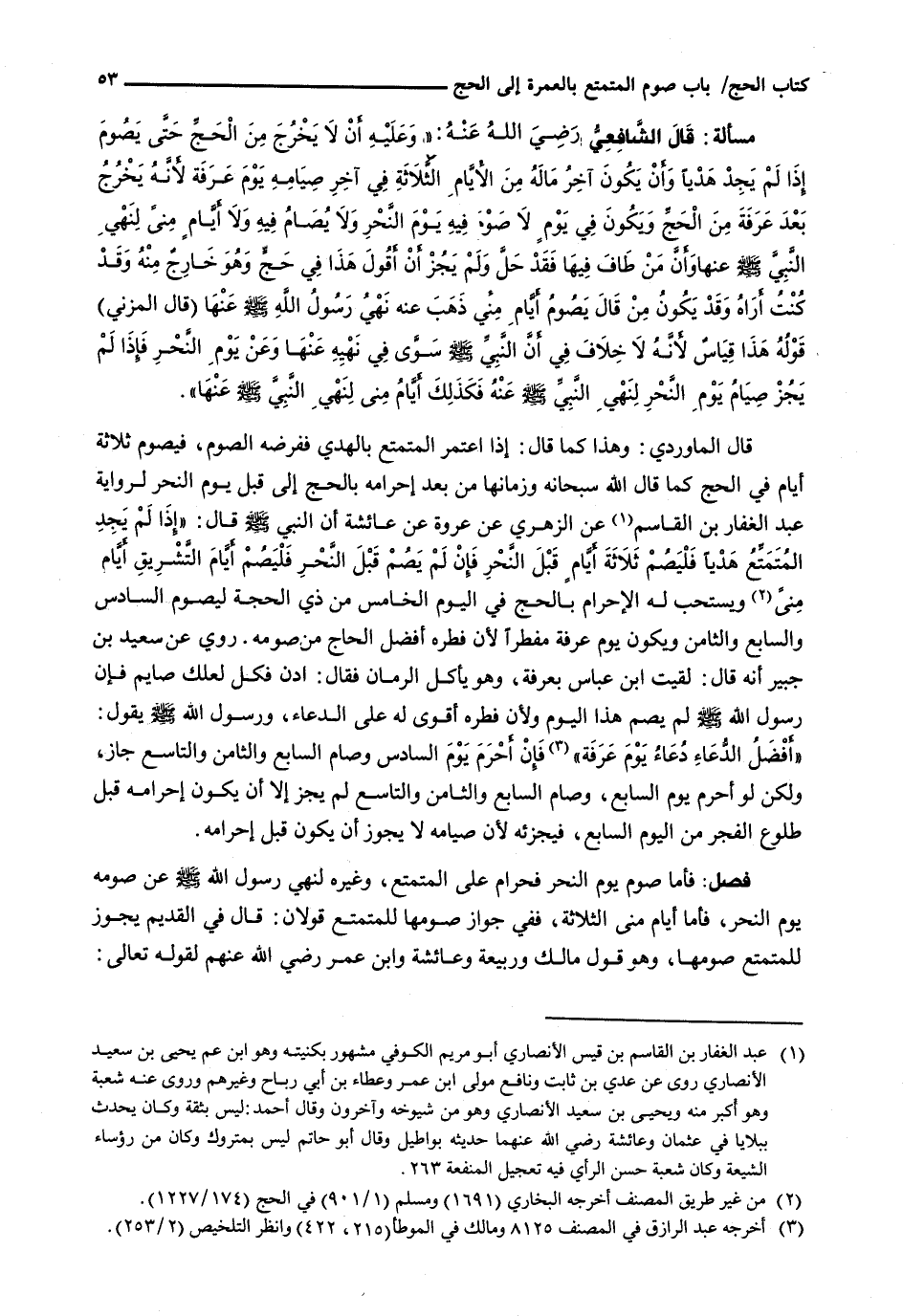 : فَأَمَّا صَوْمُ يَوْمِ النَّحْرِ فَحَرَامٌ عَلَى الْمُتَمَتِّعِ، وَغَيْرِهِ لِنَهْيِ رَسُولِ اللَّهِ - صَلَّى اللَّهُ عَلَيْهِ وَسَلَّم َ - عَنْ صَوْمِهِ يَوْمَ النَّحْرِ، فَأَمَّا أَيَّامُ مِنًى الثَّلَاثَةُ، فَفِي جَوَازِ صَوْمِهَا لِلْمُتَمَتِّعِ قَوْلَانِ: قَالَ فِي الْقَدِيمِ يَجُوزُ لِلْمُتَمَتِّعِ صَوْمُهَا، وَهُوَ قَوْلُ مَالِكٍ وَرَبِيعَةَ وَعَائِشَةَ وَابْنِ عُمَرَ رَضِيَ اللَّهُ عَنْهُمْ لِقَوْلِهِ تَعَالَى: