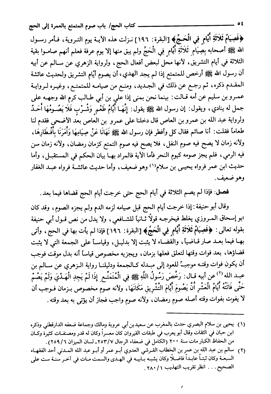 {فَصِيَامُ ثَلاَثَةِ أيَّامٍ فِي الحَجِّ) {البقرة: 196) نَزَلَتْ هَذِهِ الْآيَةُ يَوْمَ التَّرْوِيَةِ، فَأَمَرَ رَسُولُ اللَّهِ - صَلَّى اللَّهُ عَلَيْهِ وَسَلَّم َ - أَصْحَابَهُ بِصِيَامِ ثَلَاثَةِ أيامٍ فِي الْحَجِّ وَلَمْ يَبْقَ مِنْهَا إِلَّا يَوْمُ عَرَفَةَ فَعَلِمَ أَنَّهُمْ صَامُوا بَقِيَّةَ الثَّلَاثَةِ فِي أَيَّامِ التَّشْرِيقِ، لِأَنَّهَا مَحَلٌّ لِبَعْضِ أَفْعَالِ الْحَجِّ، وَلِرِوَايَةِ الزُّهْرِيِّ عَنْ سَالِمٍ عَنْ أَبِيهِ أَنَّ رَسُولَ اللَّهِ - صَلَّى اللَّهُ عَلَيْهِ وَسَلَّم َ - أَرْخَصَ لِلْمُتَمَتِّعِ إِذَا لَمْ يَجِدِ الْهَدْيَ، أَنْ يَصُومَ أَيَّامَ التَّشْرِيقِ وَلِحَدِيثِ عَائِشَةَ الْمُقَدَّمِ ذِكْرُهُ، ثُمَّ رَجَعَ عَنْ ذَلِكَ فِي الْجَدِيدِ، وَمَنَعَ مِنْ صِيَامِهِ لِلْمُتَمَتِّعِ، وَغَيْرِهِ لِرِوَايَةِ عَمْرِو بْنِ سُلَيْمٍ عَنْ أُمِّهِ قَالَتْ: بَيْنَمَا نَحْنُ بِمِنًى إِذَا عَلِيُّ بْنُ أَبِي طَالِبٍ كَرَّمَ اللَّهُ وَجْهَهُ عَلَى جَمَلٍ لَهُ يُنَادِي، وَيَقُولُ: إِنَّ رَسُولَ اللَّهِ - صَلَّى اللَّهُ عَلَيْهِ وَسَلَّم َ - يَقُولُ: إِنَّهَا أَيَّامُ طعمٍ وشربٍ فَلَا يَصُومُهَا أحدٌ وَلِرِوَايَةِ عَبْدِ اللَّهِ بْنِ عَمْرِو بْنِ الْعَاصِ قَالَ دَخَلْنَا عَلَى عَمْرِو بْنِ الْعَاصِ بَعْدَ الْأَضْحَى فَقَدَّمَ لَنَا طَعَامًا فَقُلْتُ: أَنَا صَائِمٌ فَقَالَ كُلْ وَأَفْطِرْ فَإِنَّ رَسُولَ اللَّهِ - صَلَّى اللَّهُ عَلَيْهِ وَسَلَّم َ - نَهَانَا عَنْ صِيَامِهَا وَأَمَرَنَا بِإِفْطَارِهَا، وَلِأَنَّهُ زَمَانٌ لَا يَصِحُّ فِيهِ صَوْمُ النَّفْلِ، فَلَا يَصِحُّ فِيهِ صَوْمُ التَّمَتُّعِ كَزَمَانِ رَمَضَانَ، وَلِأَنَّهُ زَمَانٌ سُنَّ فِيهِ الرَّمْيُ، فَلَمْ يَجُزْ صَوْمُهُ كَيَوْمِ النَّحْرِ فَأَمَّا الْآيَةُ فَالْمُرَادُ بِهَا بَيَانُ الْحُكْمِ فِي الْمُسْتَقْبَلِ، وَأَمَّا حَدِيثُ ابْنِ عُمَرَ فَرَوَاهُ يَحْيَى بْنُ سَلَامٍ وَهُوَ ضَعِيفٌ، وَأَمَّا حَدِيثُ عَائِشَةَ فَرَوَاهُ عَبْدُ الْغَفَّارِ وَهُوَ ضَعِيفٌ.