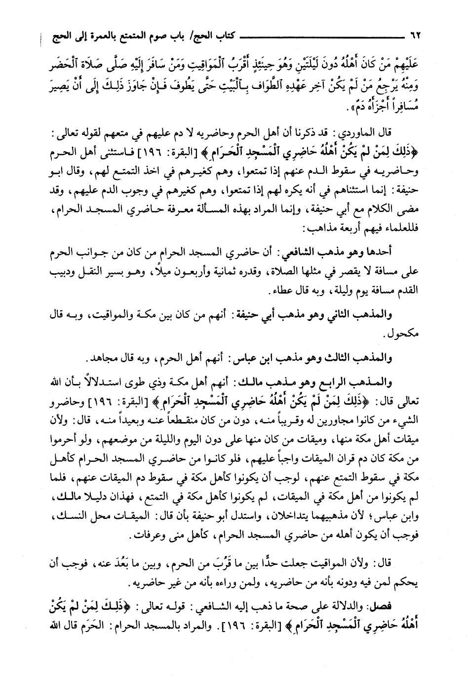 : وَالدَّلَالَةُ عَلَى صِحَّةِ مَا ذَهَبَ إِلَيْهِ الشَّافِعِيُّ: قَوْله تَعَالَى: {ذَلِكَ لِمَنْ لَمْ يَكُنْ أهْلُهُ حَاضِرِي المَسْجِدِ الحَرَامِ) {البقرة: 196) . وَالْمُرَادُ بِالْمَسْجِدِ الْحَرَامِ: الْحَرَمُ قَالَ اللَّهُ