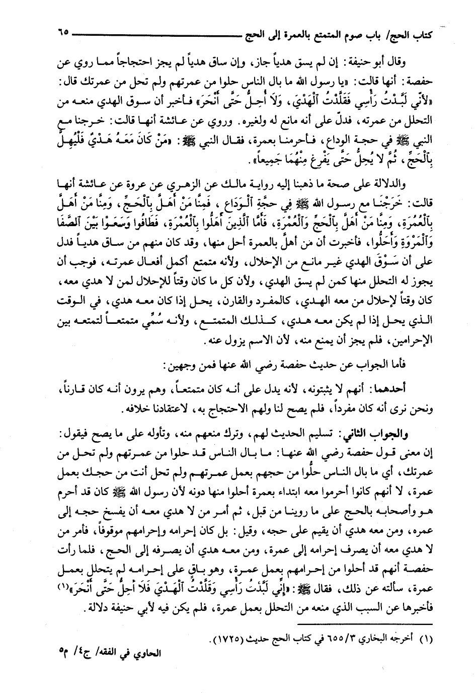 وَالْجَوَابُ الثَّانِي: تَسْلِيمُ الْحَدِيثِ لَهُمْ، وَتَرْكُ مَنْعِهِمْ مِنْهُ، وَتَأَوُّلُهُ عَلَى مَا يَصِحُّ فَيَقُولُ: إِنَّ مَعْنَى قَوْلِ حَفْصَةَ رَضِيَ اللَّهُ عَنْهَا: مَا بَالُ النَّاسِ قَدْ حَلُّوا مِنْ عُمْرَتِهِمْ وَلَمْ تَحِلَّ مِنْ عُمْرَتِكَ، أَيْ مَا بَالُ النَّاسِ حَلُّوا مِنْ حَجِّهِمْ بِعَمَلِ عُمْرَتِهِمْ وَلَمْ تَحِلَّ أَنْتَ مِنْ حَجِّكَ بِعَمَلِ عُمْرَةٍ، لَا أَنَّهُمْ كَانُوا أَحْرَمُوا مَعَهُ ابْتِدَاءً بِعُمْرَةٍ أَحَلُّوا مِنْهَا دُونَهُ لِأَنَّ رَسُولَ اللَّهِ - صَلَّى اللَّهُ عَلَيْهِ وَسَلَّم َ - كَانَ قَدْ أَحْرَمَ هُوَ وَأَصْحَابُهُ بِالْحَجِّ عَلَى مَا رَوَيْنَا مِنْ قَبْلُ، ثُمَّ أَمَرَ مَنْ لَا هَدْيَ مَعَهُ أَنْ يَفْسَخَ حَجَّهُ إِلَى عُمْرَةٍ، وَمَنْ مَعَهُ هَدْيٌ أَنْ يُقِيمَ عَلَى حَجِّهِ، وَقِيلَ: بَلْ كَانَ إِحْرَامُهُ وَإِحْرَامُهُمْ مَوْقُوفًا، فَأَمَرَ مَنْ لَا هَدْيَ مَعَهُ أَنْ يَصْرِفَ إِحْرَامَهُ إِلَى عُمْرَةٍ، وَمَنْ مَعَهُ هَدْيٌ أَنْ يصرفه إلى الحج، فلما رأت حفصة أَنَّهُمْ قَدْ أَحَلُّوا مِنْ إِحْرَامِهِمْ بِعَمَلِ عُمْرَةٍ، وَهُوَ باقٍ عَلَى إِحْرَامِهِ لَمْ يَتَحَلَّلْ بِعَمَلِ عُمْرَةٍ، سَأَلْتُهُ عَنْ ذَلِكَ، فَقَالَ - صَلَّى اللَّهُ عَلَيْهِ وَسَلَّم َ -: " أَنِّي لَبَّدْتُ رَأْسِي وَقَلَّدْتُ الْهَدْيَ فَلَا أُحِلُّ حَتَّى أَنْحَرَ " فَأَخْبَرَهَا عَنِ السَّبَبِ الَّذِي مَنَعَهُ مِنَ التَّحَلُّلِ بِعَمَلِ عُمْرَةٍ، فَلَمْ يَكُنْ فِيهِ لأبي حنيفة دَلَالَةٌ.