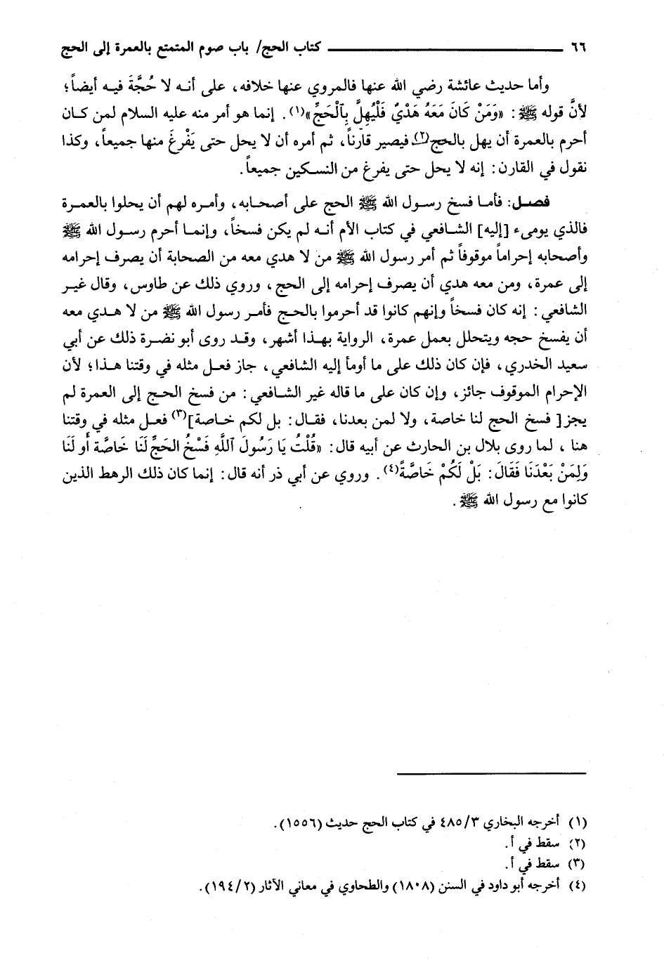 : فَأَمَّا فَسْخُ رَسُولِ اللَّهِ - صَلَّى اللَّهُ عَلَيْهِ وَسَلَّم َ - الْحَجَّ عَلَى أَصْحَابِهِ، وَأَمْرُهُ لَهُمْ أَنْ يُحِلُّوا بالعمرة فالذي يومئ (إليه) الشَّافِعِيُّ فِي كِتَابِ الْأُمِّ أَنَّهُ لَمْ يَكُنْ فَسْخًا، وَإِنَّمَا أَحْرَمَ رَسُولُ اللَّهِ - صَلَّى اللَّهُ عَلَيْهِ وَسَلَّم َ - وَأَصْحَابُهُ إِحْرَامًا مَوْقُوفًا ثُمَّ أَمَرَ رَسُولُ اللَّهِ - صَلَّى اللَّهُ عَلَيْهِ وَسَلَّم َ - مَنْ لَا هَدْيَ مَعَهُ مِنَ الصَّحَابَةِ أَنْ يَصْرِفَ إِحْرَامَهُ إِلَى عُمْرَةٍ، وَمَنْ مَعَهُ هَدْيٌ أَنْ يَصْرِفَ إِحْرَامَهُ إِلَى الْحَجِّ، وَرُوِيَ ذَلِكَ عَنْ طَاوُسٍ، وَقَالَ غَيْرُ الشَّافِعِيِّ: إِنَّهُ كَانَ فَسْخًا وَإِنَّهُمْ كَانُوا قَدْ أَحْرَمُوا بِالْحَجِّ فَأَمَرَ رَسُولُ اللَّهِ - صَلَّى اللَّهُ عَلَيْهِ وَسَلَّم َ - مَنْ لَا هَدْيَ مَعَهُ أَنْ يَفْسَخَ حَجَّهُ ويتحلل بعمل عمرة، الرواية بِهَذَا أَشْهَرُ، وَقَدْ رَوَى أَبُو نَضْرَةَ ذَلِكَ عَنْ أَبِي سَعِيدٍ الْخُدْرِيِّ، فَإِنْ كَانَ ذَلِكَ عَلَى مَا أَوْمَأَ إِلَيْهِ الشَّافِعِيُّ، جَازَ فِعْلُ مِثْلِهِ فِي وَقْتِنَا هَذَا؛ لِأَنَّ الْإِحْرَامَ الْمَوْقُوفَ جَائِزٌ، وَإِنْ كَانَ عَلَى مَا قَالَهُ غَيْرُ الشَّافِعِيِّ: مِنْ فَسْخِ الْحَجِّ إِلَى الْعُمْرَةِ لَمْ يجز (فسخ الحج لنا خاصة، ولا لمن بعدنا، فقال: بل لكم خاصة) فعل مثله في وقتنا هنا، لِمَا رَوَى بِلَالُ بْنُ الْحَارِثِ عَنْ أَبِيهِ قَالَ: " قُلْتُ يَا رَسُولَ اللَّهِ فَسْخُ الْحَجِّ لَنَا خَاصَّةً أَوْ لَنَا وَلِمَنْ بَعْدَنَا فَقَالَ: بَلْ لَكُمْ خَاصَّةً. وَرُوِيَ عَنْ أَبِي ذَرٍّ أنه قال: إنما كان ذلك الرهط الَّذِينَ كَانُوا مَعَ رَسُولِ اللَّهِ - صَلَّى اللَّهُ عَلَيْهِ وَسَلَّم َ -.