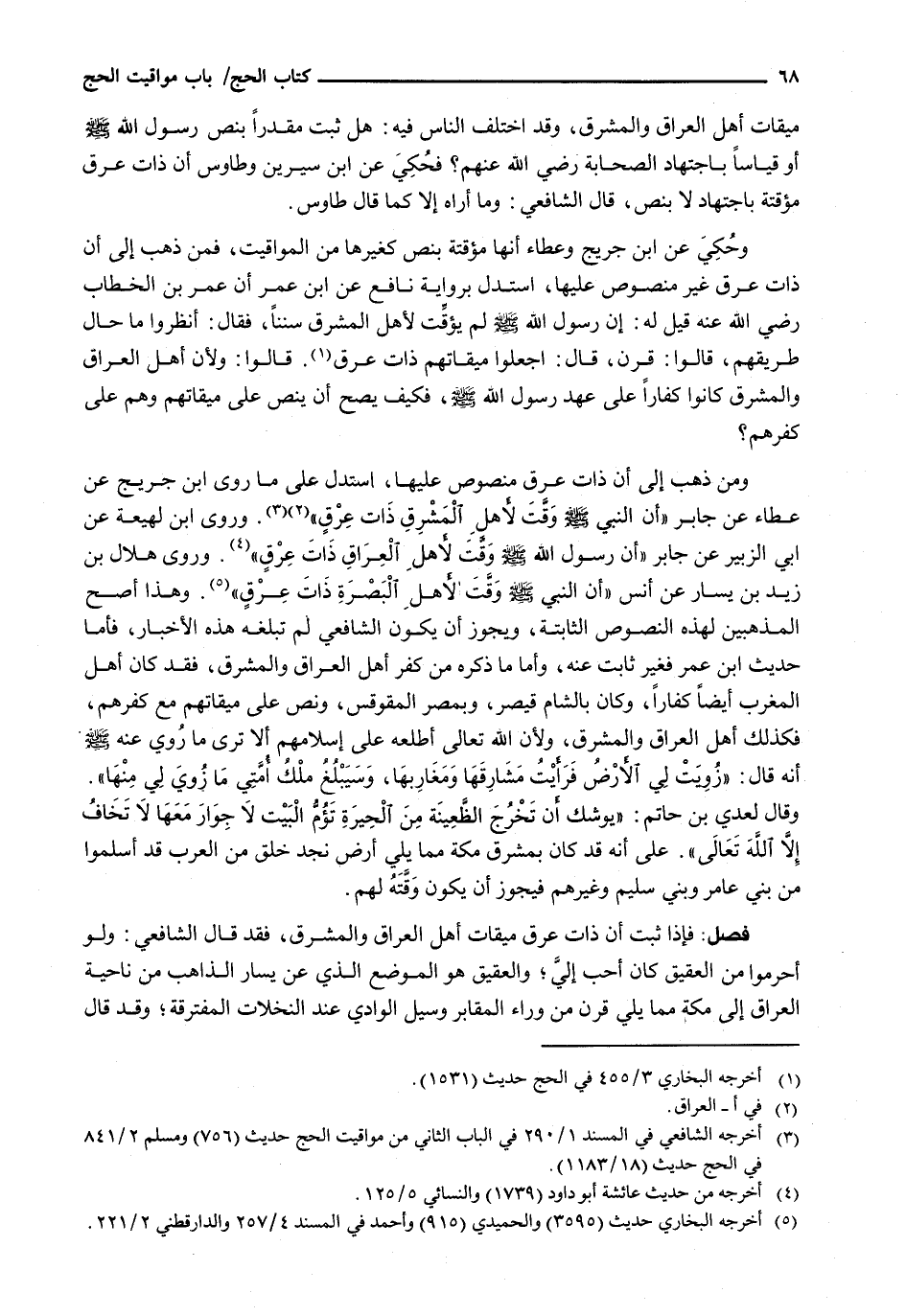 وَمَنْ ذَهَبَ إِلَى أَنَّ ذَاتَ عِرْقٍ مَنْصُوصٌ عَلَيْهَا، اسْتَدَلَّ عَلَى مَا رَوَى ابْنُ جُرَيْجٍ عَنْ عَطَاءٍ عَنْ جَابِرٍ " أَنَّ النَّبِيَّ - صَلَّى اللَّهُ عَلَيْهِ وَسَلَّم َ - وَقَّتَ لِأَهْلِ الْمَشْرِقِ ذَاتَ عرقٍ ". وَرَوَى ابْنُ لَهِيعَةٍ عَنْ أَبِي الزُّبَيْرِ عَنْ جَابِرٍ " أَنَّ رَسُولَ اللَّهِ - صَلَّى اللَّهُ عَلَيْهِ وَسَلَّم َ - وَقَّتَ لِأَهْلِ الْعِرَاقِ ذَاتَ عرقٍ ". وَرَوَى هِلَالُ بْنُ زَيْدِ بْنِ يَسَارٍ عَنْ أَنَسٍ " أَنَّ النَّبِيَّ - صَلَّى اللَّهُ عَلَيْهِ وَسَلَّم َ - وَقَّتَ لِأَهْلِ الْبَصْرَةِ ذَاتَ عرقٍ ". وَهَذَا أَصَحُّ الْمَذْهَبَيْنِ لِهَذِهِ النُّصُوصِ الثَّابِتَةِ، وَيَجُوزُ أَنْ يَكُونَ الشَّافِعِيُّ لَمْ تَبْلُغْهُ هَذِهِ الْأَخْبَارُ، فَأَمَّا حَدِيثُ ابْنِ عُمَرَ فَغَيْرُ ثَابِتٍ عَنْهُ، وَأَمَّا مَا ذَكَرَهُ مِنْ كُفْرِ أَهْلِ الْعِرَاقِ وَالْمَشْرِقِ، فَقَدْ كَانَ أَهْلُ الْمَغْرِبِ أَيْضًا كُفَّارًا، وَكَانَ بِالشَّامِ قَيْصَرُ، وَبِمِصْرَ الْمُقَوْقِسُ، وَنَصَّ عَلَى مِيقَاتِهِمْ مَعَ كُفْرِهِمْ، فَكَذَلِكَ أَهْلُ الْعِرَاقِ وَالْمَشْرِقِ، وَلِأَنَّ اللَّهَ تَعَالَى أَطْلَعَهُ عَلَى إِسْلَامِهِمْ أَلَا تَرَى مَا رُوي عَنْهُ - صَلَّى اللَّهُ عَلَيْهِ وَسَلَّم َ - أَنَّهُ قَالَ: " زُوِيَتْ لِيَ الْأَرْضُ فَرَأَيْتُ مَشَارِقَهَا وَمَغَارِبَهَا، وَسَيَبْلُغُ مُلْكُ أُمَّتِي مَا زُوِيَ لِي مِنْهَا ". وَقَالَ لِعَدِيِّ بْنِ حَاتِمٍ: " يُوشِكُ أَنْ تَخْرُجَ الظَّعِينَةُ مِنَ الْحِيرَةِ تَؤُمُّ الْبَيْتَ لَا جِوَارَ مَعَهَا لَا تَخَافُ إِلَّا اللَّهَ تَعَالَى ". عَلَى أَنَّهُ قَدْ كَانَ بِمُشْرِقِ مَكَّةَ مِمَّا يَلِي أَرْضَ نَجْدٍ خَلْقٌ مِنَ الْعَرَبِ قَدْ أَسْلَمُوا مِنْ بَنِي عَامِرٍ وَبَنِي سُلَيْمٍ وَغَيْرِهِمْ فَيَجُوزُ أَنْ يَكُونَ وَقَّتَهُ لَهُمْ.