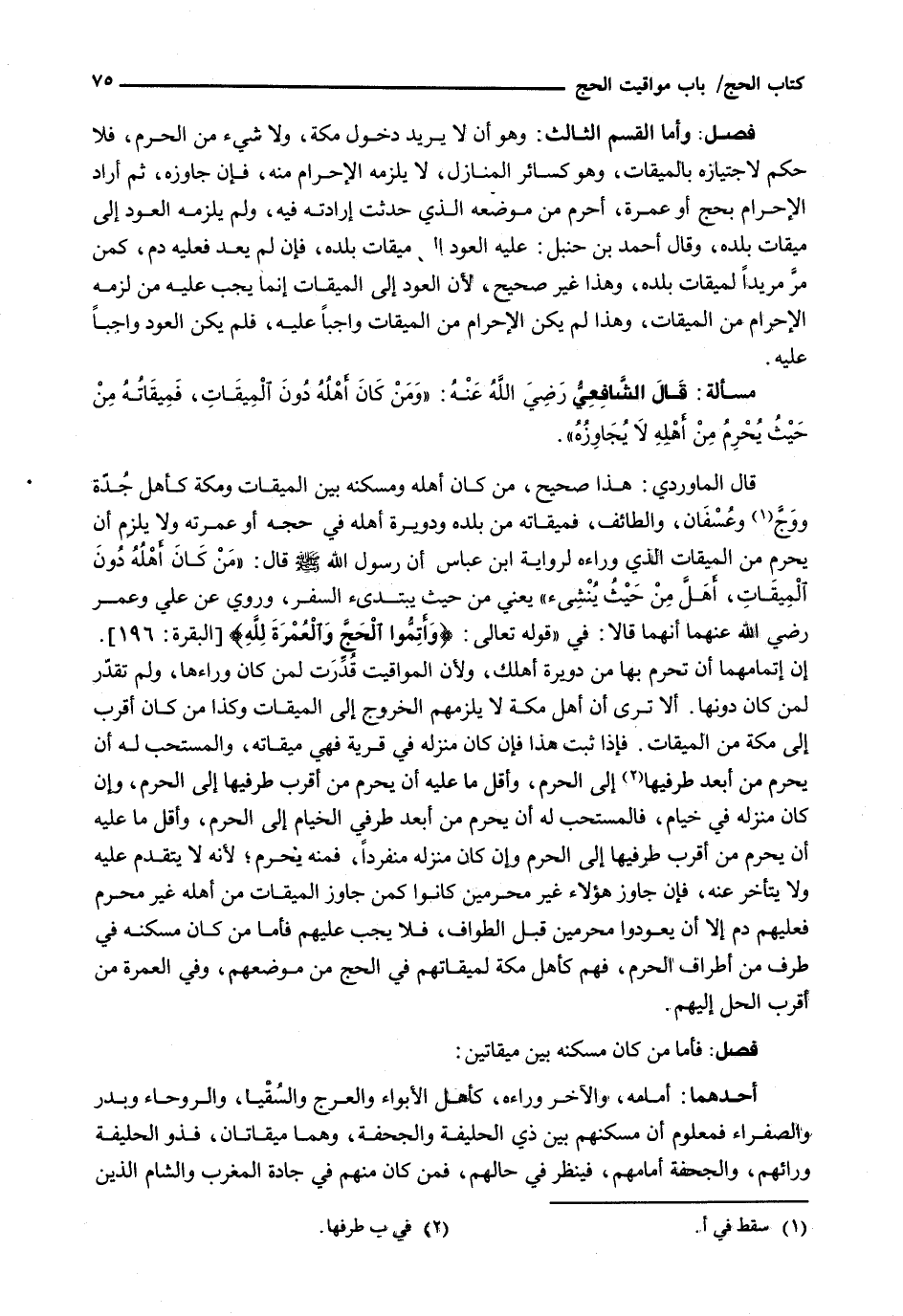 أَحَدُهُمَا: أَمَامَهُ، وَالْآخَرُ وَرَاءَهُ، كَأَهْلِ الْأَبْوَاءِ وَالْعَرَجِ وَالسُقْيَا، وَالرَّوْحَاءِ وَبَدْرٍ وَالصَّفْرَاءِ فَمَعْلُومٌ أَنَّ مَسْكَنَهُمْ بَيْنَ ذِي الْحُلَيْفَةِ وَالْجُحْفَةِ، وَهُمَا مِيقَاتَانِ، فَذُو الْحُلَيْفَةِ ورائهم، وَالْجُحْفَةُ أَمَامَهُمْ، فَيَنْظُرَ فِي حَالِهِمْ، فَمَنْ كَانَ مِنْهُمْ فِي جَادَّةِ الْمَغْرِبِ وَالشَّامِ الَّذِينَ