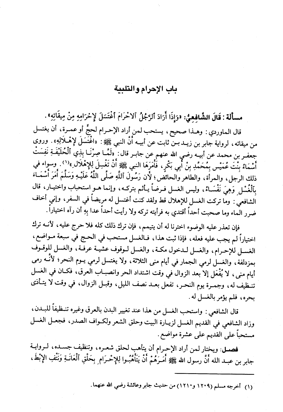 قَالَ الْمَاوَرْدِيُّ: وَهَذَا صَحِيحٌ، يُسْتَحَبُّ لِمَنْ أَرَادَ الْإِحْرَامَ لِحَجٍّ أَوْ عُمْرَةٍ، أَنْ يَغْتَسِلَ مِنْ مِيقَاتِهِ، لِرِوَايَةِ جَابِرِ بْنِ زَيْدِ بْنِ ثَابِتٍ عَنْ أَبِيهِ أَنَّ النَّبِيَّ - صَلَّى اللَّهُ عَلَيْهِ وَسَلَّم َ -: " اغْتَسَلَ لِإِهْلَالِهِ ". وَرَوَى جَعْفَرُ بْنُ مُحَمَّدٍ عَنْ أَبِيهِ رَضِيَ اللَّهُ عَنْهُمْ عَنْ جَابِرٍ قَالَ: " لَمَّا صِرْنَا بِذِي الْحُلَيْفَةِ نَفِسَتْ أَسْمَاءُ بِنْتُ عُمَيْسٍ بِمُحَمَّدِ بْنِ أَبِي بَكْرٍ، فَأَمَرَهَا النَّبِيُّ - صَلَّى اللَّهُ عَلَيْهِ وَسَلَّم َ - أن تغتسل لِلْإِهْلَالِ ". وَسَوَاءٌ فِي ذَلِكَ الرَّجُلُ، وَالْمَرْأَةُ، وَالطَّاهِرُ وَالْحَائِضُ؛ لِأَنَّ رَسُولَ اللَّهِ - صَلَّى اللَّهُ عَلَيْهِ وَسَلَّم َ - أَمَرَ أَسْمَاءَ بِالْغُسْلِ وَهِيَ نُفَسَاءُ، وَلَيْسَ الْغُسْلُ فَرْضًا يَأْثَمُ بِتَرْكِهِ، وَإِنَّمَا هُوَ اسْتِحْبَابٌ وَاخْتِيَارٌ، قَالَ الشَّافِعِيُّ: وَمَا تَرَكْتُ الْغُسْلَ لِلْإِهْلَالِ قَطُّ وَلَقَدْ كُنْتُ أَغْتَسِلُ لَهُ مَرِيضًا فِي السَّفَرِ، وَإِنِّي أَخَافُ ضَرَرَ الْمَاءِ وَمَا صَحِبْتُ أَحَدًا أَقْتَدِي بِهِ فَرَأَيْتُهُ تَرَكَهُ وَلَا رَأَيْتُ أَحَدًا عَدَا بِهِ أَنْ رَآهُ اخْتِيَارًا.
