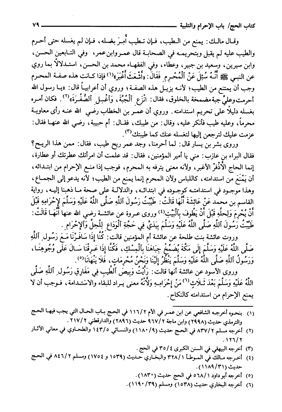 وَرَوَتْ عَائِشَةُ بِنْتُ طَلْحَةَ عَنْ عَائِشَةَ أُمِّ الْمُؤْمِنِينَ قَالَتْ: كُنَّا إِذَا سَافَرْنَا مَعَ رَسُولِ اللَّهِ - صَلَّى اللَّهُ عَلَيْهِ وَسَلَّم َ - إلى مكة يضمخ جباهنا بالمسك، فكنا إذا عرقنا سال عَلَى وُجُوهِنَا، وَرَسُولُ اللَّهِ - صَلَّى اللَّهُ عَلَيْهِ وَسَلَّم َ - يَنْظُرُ إِلَيْنَا وَنَحْنُ مُحْرِمَاتٌ، فَلَا يَنْهَانَا.