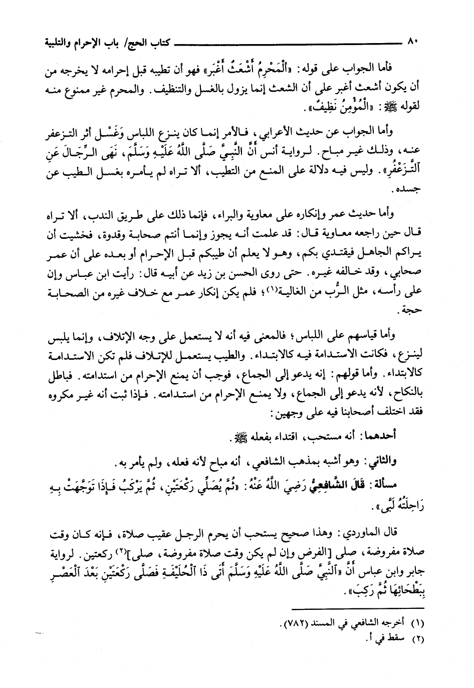 وَأَمَّا حَدِيثُ عُمَرَ وَإِنْكَارُهُ عَلَى مُعَاوِيَةَ وَالْبَرَاءِ، فَإِنَّمَا ذَلِكَ عَلَى طَرِيقِ النَّدْبِ، أَلَا تَرَاهُ قَالَ حِينَ رَاجَعَهُ مُعَاوِيَةُ قَالَ: قَدْ عَلِمْتُ أَنَّهُ يَجُوزُ وَإِنَّمَا أَنْتُمْ صَحَابَةٌ وَقُدْوَةٌ، فَخَشِيتُ أَنْ يَرَاكُمُ الْجَاهِلُ فَيَقْتَدِيَ بِكُمْ، وَهُوَ لَا يَعْلَمُ أَنَّ طِيبَكُمْ قَبْلَ الْإِحْرَامِ أَوْ بَعْدَهُ عَلَى أَنَّ عُمَرَ صَحَابِيٌّ، وَقَدْ خَالَفَهُ غَيْرُهُ. حَتَّى رَوَى الْحَسَنُ بْنُ زَيْدٍ عَنْ أَبِيهِ قَالَ: رَأَيْتُ ابْنَ عَبَّاسٍ وَإِنَّ عَلَى رَأْسِهِ، مِثْلَ الرُّبِّ مِنَ الْغَالِيَةِ؛ فَلَمْ يَكُنْ إِنْكَارُ عُمَرَ مَعَ خِلَافِ غَيْرِهِ مِنَ الصَّحَابَةِ حُجَّةً.
