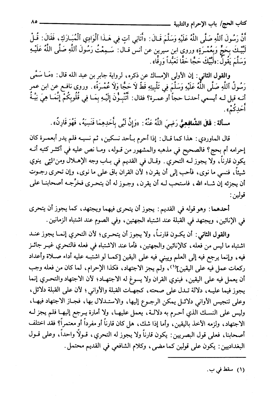 وَالْقَوْلُ الثَّانِي: أَنْ يَكُونَ قَارِنًا، وَلَا يَجُوزُ أَنْ يَتَحَرَّى؛ لِأَنَّ التَّحَرِّيَ إِنَّمَا يَجُوزُ عِنْدَ اشْتِبَاهِ مَا لَيْسَ مِنْ فِعْلِهِ، كَالْإِنَائَيْنِ وَالْجِهَتَيْنِ، فَأَمَّا عِنْدَ الِاشْتِبَاهِ فِي فِعْلِهِ فَالتَّحَرِّي غَيْرُ جَائِزٍ فِيهِ، وَإِنَّمَا يَرْجِعُ فِيهِ إِلَى الْعِلْمِ وَيَبْنِي فيه على اليقين كما لو اشتبه عليه أداء صلاة وأعداد ركعات عمل فِيهِ عَلَى الْيَقِينِ، وَلَمْ يَجُزِ الِاجْتِهَادُ، فَكَذَا الْإِحْرَامُ، لَمَّا كَانَ مِنْ فِعْلِهِ وَجَبَ أَنْ يعمل فيه على اليقين، فينوي القرن وَلَا يُسَوَّغُ لَهُ الِاجْتِهَادُ؛ لِأَنَّ الِاجْتِهَادَ وَالتَّحَرِّيَ إِنَّمَا يَجُوزُ فِيمَا عَلَيْهِ، دَلَالَةٌ تَدُلُّ عَلَى صِحَّتِهِ، كَجِهَاتِ الْقِبْلَةِ وَالْأَوَانِي؛ لِأَنَّ عَلَى الْقِبْلَةِ دَلَائِلَ، وَعَلَى تَنْجِيسِ الْأَوَانِي دَلَائِلَ يُمْكِنُ الرُّجُوعُ إِلَيْهَا، وَالِاسْتِدْلَالُ بِهَا، فَجَازَ الِاجْتِهَادُ فِيهَا، وَلَيْسَ عَلَى النُّسُكِ الَّذِي أَحْرَمَ بِهِ دَلَالَةٌ، يُعْمَلُ عَلَيْهَا، وَلَا أَمَارَةَ يُرْجَعُ إِلَيْهَا فَلَمْ يَجُزْ لَهُ الِاجْتِهَادُ، وَلَزِمَهُ الْأَخْذُ بِالْيَقِينِ، وَأَمَّا إِذَا شَكَّ، هَلْ كَانَ قَارِنًا أَوْ مُفْرِدًا أَوْ مُعْتَمِرًا؟ فَقَدِ اخْتَلَفَ أَصْحَابُنَا، فَعَلَى قَوْلِ الْبَصْرِيِّينَ: يَكُونُ قَارِنًا وَلَا يَجُوزُ لَهُ التَّحَرِّي، قَوْلًا وَاحِدًا، وَعَلَى قَوْلِ الْبَغْدَادِيِّينَ، يَكُونُ عَلَى قَوْلَيْنِ كَمَا مَضَى، وَكَلَامُ الشَّافِعِيِّ فِي الْقَدِيمِ مُحْتَمَلٌ.