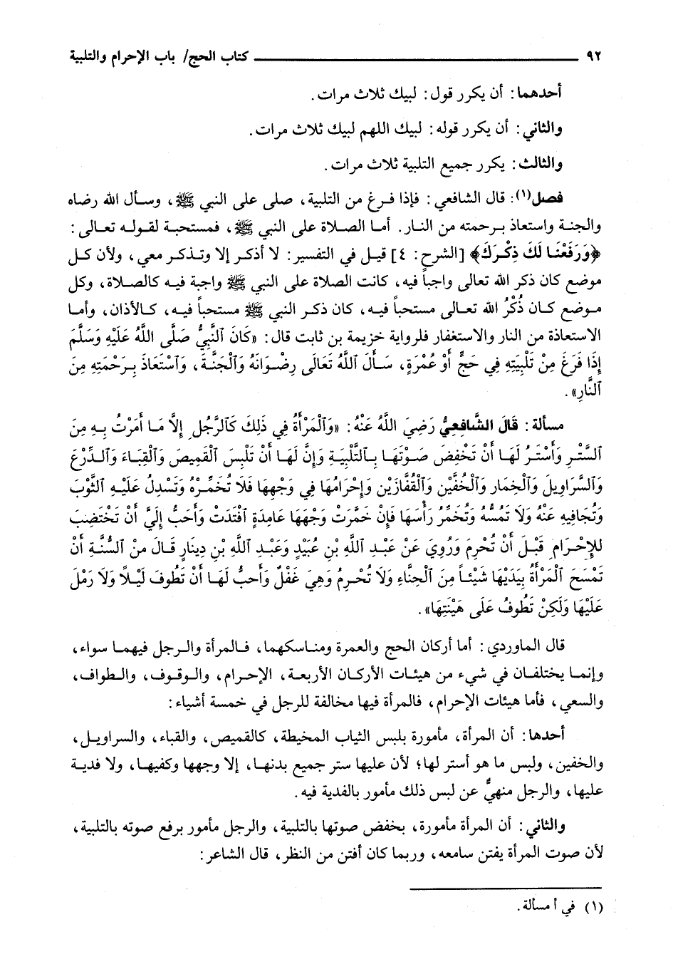 : قَالَ الشَّافِعِيُّ: فَإِذَا فَرَغَ مِنَ التَّلْبِيَةِ صَلَّى عَلَى النَّبِيِّ - صَلَّى اللَّهُ عَلَيْهِ وَسَلَّم َ -، ويسأل اللَّهَ رِضَاهُ وَالْجَنَّةَ وَاسْتَعَاذَ بِرَحْمَتِهِ مِنَ النَّارِ. أَمَّا الصَّلَاةُ عَلَى النَّبِيِّ - صَلَّى اللَّهُ عَلَيْهِ وَسَلَّم َ -، فَمُسْتَحَبَّةٌ لِقَوْلِهِ تَعَالَى: {وَرَفَعْنَا لَكَ ذِكْرَكَ) {الشرح: 4) قِيلَ فِي التَّفْسِيرِ: لَا أُذْكَرُ إِلَّا وَتُذْكَرُ مَعِي، وَلِأَنَّ كُلَّ مَوْضِعٍ كَانَ ذِكْرُ اللَّهِ تَعَالَى وَاجِبًا فِيهِ، كَانَتِ الصَّلَاةُ عَلَى النَّبِيِّ - صَلَّى اللَّهُ عَلَيْهِ وَسَلَّم َ - وَاجِبَةً فِيهِ كَالصَّلَاةِ، وَكُلُّ مَوْضِعٍ كَانَ ذِكْرُ اللَّهِ تَعَالَى مُسْتَحَبًّا فِيهِ، كَانَ ذِكْرُ النَّبِيِّ - صَلَّى اللَّهُ عَلَيْهِ وَسَلَّم َ - مُسْتَحَبًّا فِيهِ، كَالْأَذَانِ، وَأَمَّا الِاسْتِعَاذَةُ مِنَ النَّارِ وَالِاسْتِغْفَارُ فَلِرِوَايَةِ خُزَيْمَةَ بْنِ ثَابِتٍ قَالَ: " كَانَ النَّبِيُّ - صَلَّى اللَّهُ عَلَيْهِ وَسَلَّم َ - إِذَا فَرَغَ مِنْ تَلْبِيَتِهِ فِي حَجٍّ أَوْ عمرةٍ، سَأَلَ اللَّهَ تَعَالَى رِضْوَانَهُ وَالْجَنَّةَ، وَاسْتَعَاذَ برحمته من النار ".