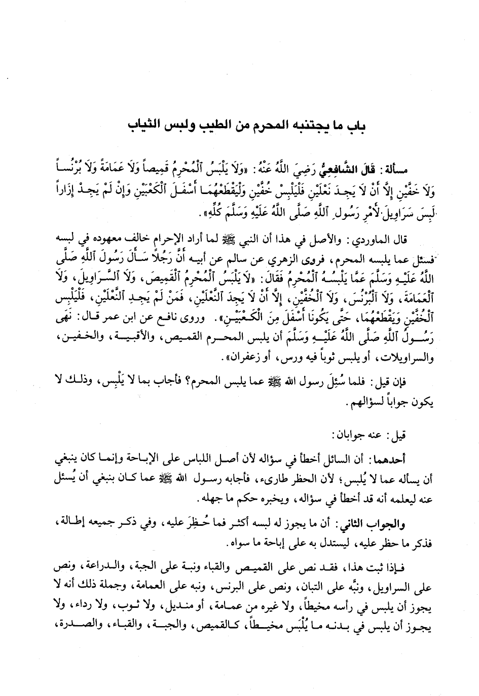 قَالَ الْمَاوَرْدِيُّ: وَالْأَصْلُ فِي هَذَا أَنَّ النبي - صَلَّى اللَّهُ عَلَيْهِ وَسَلَّم َ - لَمَّا أَرَادَ الْإِحْرَامَ خَالَفَ مَعْهُودَهُ فِي لُبْسِهِ فَسُئِلَ عَمَّا يَلْبَسُهُ الْمُحْرِمُ، فَرَوَى الزُّهْرِيُّ عَنْ سَالِمٍ عَنْ أَبِيهِ أَنَّ رَجُلًا سَأَلَ رَسُولَ اللَّهِ - صَلَّى اللَّهُ عَلَيْهِ وَسَلَّم َ - عَمَّا يَلْبَسُهُ الْمُحْرِمُ فَقَالَ: " لَا يَلْبَسُ الْمُحْرِمُ الْقَمِيصَ، وَلَا السَّرَاوِيلَ، وَلَا الْعِمَامَةَ، وَلَا الْبُرْنُسَ، وَلَا الْخُفَّيْنِ، إِلَّا أَنْ لَا يَجِدَ النَّعْلَيْنِ، فَمَنْ لَمْ يَجِدِ النَّعْلَيْنِ، فَلْيَلْبَسِ الْخُفَّيْنِ وَيَقْطَعْهُمَا، حَتَى يَكُونَا أَسْفَلَ مِنَ الْكَعْبَيْنِ ". وَرَوَى نَافِعٌ عَنِ ابْنِ عُمَرَ قَالَ: نَهَى رَسُولُ اللَّهِ - صَلَّى اللَّهُ عَلَيْهِ وَسَلَّم َ - أَنْ يَلْبَسَ الْمُحْرِمُ الْقَمِيصَ، وَالْأَقْبِيَةَ، وَالْخُفَّيْنِ، وَالسَّرَاوِيلَاتِ، أَوْ يَلْبَسُ ثَوْبًا فِيهِ وَرَسٌ، أَوْ زَعْفَرَانٌ ".