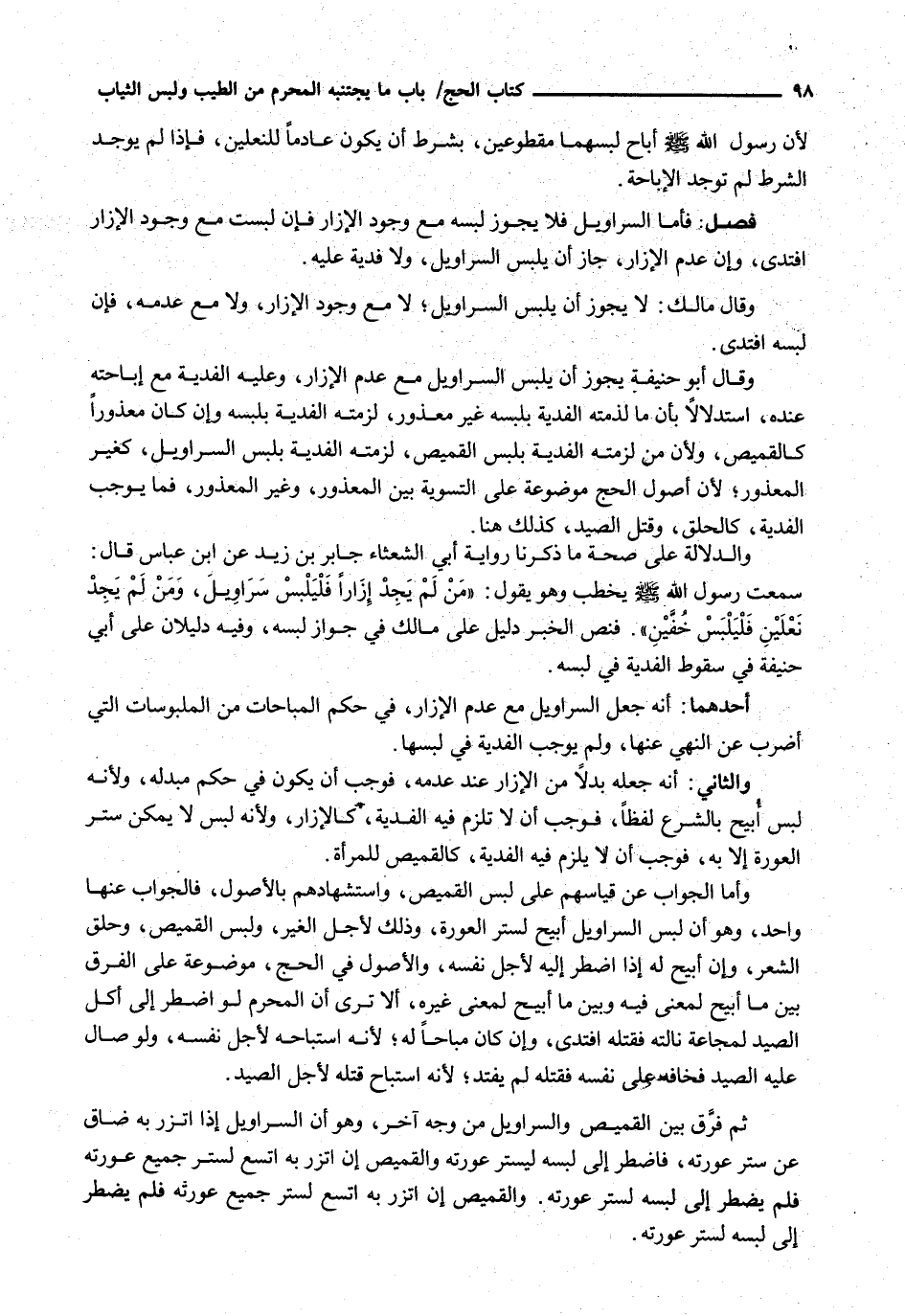 وَقَالَ أبو حنيفة يَجُوزُ أَنْ يَلْبَسَ السَّرَاوِيلَ مَعَ عَدَمِ الْإِزَارِ، وَعَلَيْهِ الْفِدْيَةُ مَعَ إِبَاحَتِهِ عِنْدَهُ، اسْتِدْلَالًا بِأَنَّ مَا لذمته الفدية يلبسه غَيْرُ مَعْذُورٍ، لَزِمَتْهُ الْفِدْيَةُ بِلُبْسِهِ وَإِنْ كَانَ مَعْذُورًا كَالْقَمِيصِ، وَلِأَنَّ مَنْ لَزِمَتْهُ الْفِدْيَةُ بِلُبْسِ الْقَمِيصِ، لَزِمَتْهُ الْفِدْيَةُ بِلُبْسِ السَّرَاوِيلِ، كَغَيْرِ الْمَعْذُورِ؛ لِأَنَّ أُصُولَ الْحَجِّ مَوْضُوعَةٌ عَلَى التَّسْوِيَةِ بَيْنَ الْمَعْذُورِ، وَغَيْرِ الْمَعْذُورِ، فَمَا يُوجِبُ الْفِدْيَةَ، كَالْحَلْقِ، وَقَتْلِ الصَّيْدِ، كَذَلِكَ هُنَا.