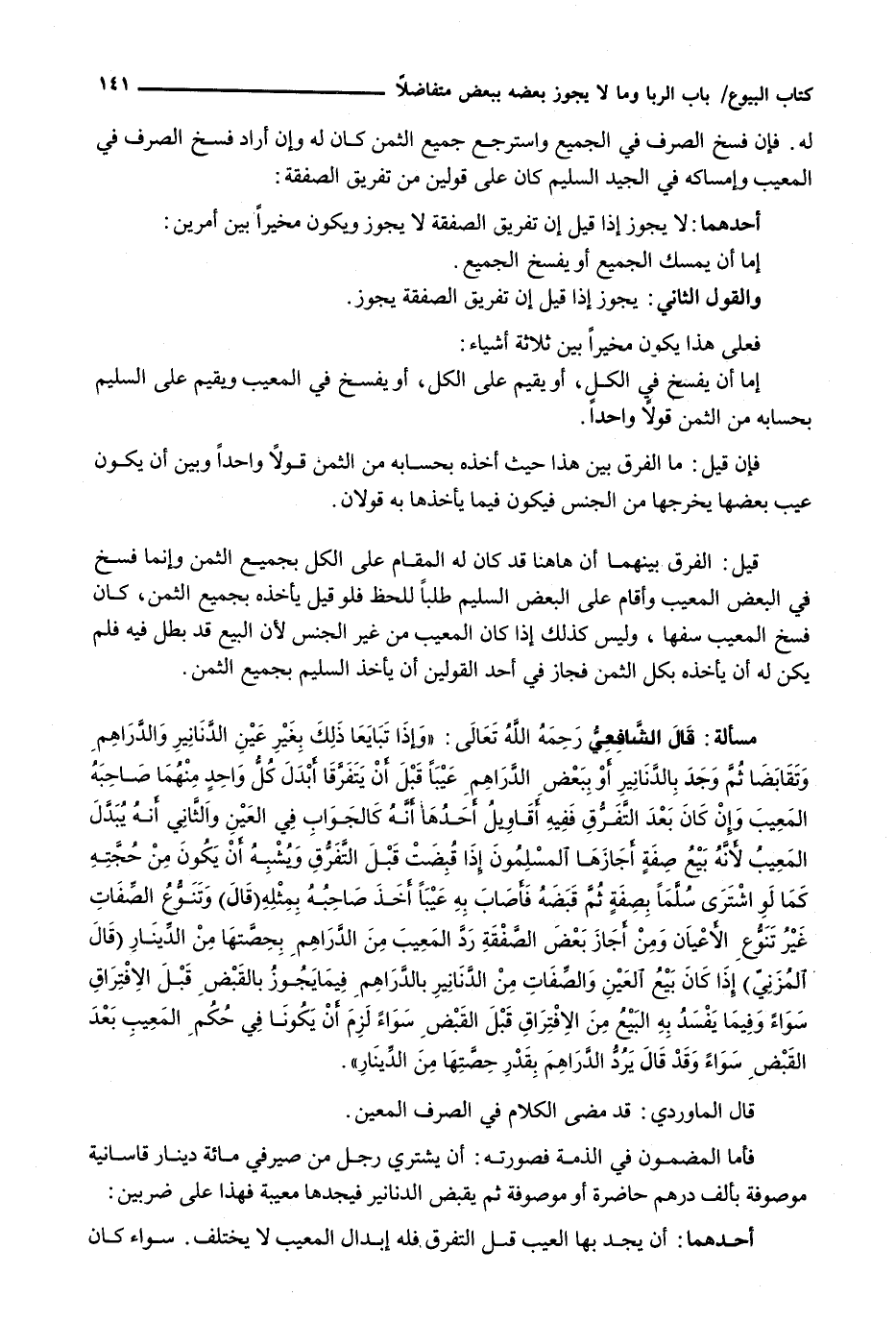 قال الشافعي رحمه الله تعالى: " وَإِذَا تَبَايَعَا ذَلِكَ بِغَيْرِ عَيْنِ الدَّنَانِيرِ وَالدَّرَاهِمِ وَتَقَابَضَا ثُمَّ وَجَدَ بِالدَّنَانِيرِ أَوْ بِبَعْضِ الدَّرَاهِمِ عَيْبًا قَبْلَ أَنْ يَتَفَرَّقَا أَبْدَلَ كُلُّ وَاحِدٍ مِنْهُمَا صَاحِبَهُ الْمَعِيبَ وَإِنْ كَانَ بَعْدَ التَّفَرُّقِ ففيه أقاويل أحدها أنه كالجواب في العين والثاني أنه يبدل المعيب لأنه بيع صفة أجازها المسلمون إذا قبضت قبل التفرق ويشبه أن يكون من حجته كما لو اشترى سلما بصفة ثم قبضه فأصاب به عيبا أخذ صاحبه بمثله (قال) وتنوع الصفات غير تنوع الأعيان ومن أجاز بعض الصفقة رد المعيب من الدراهم بحصتها من الدينار (قال المزني) إذا كان بيع العين والصفات من الدنانير بالدراهم فيما يجوز بالقبض قبل الافتراق سواء وفيما يفسد به البيع من الافتراق قبل القبض سواء لزم أن يكونا في حكم المعيب بعد القبض سواء وقد قال يرد الدراهم بقدر حصتها من الدينار ".