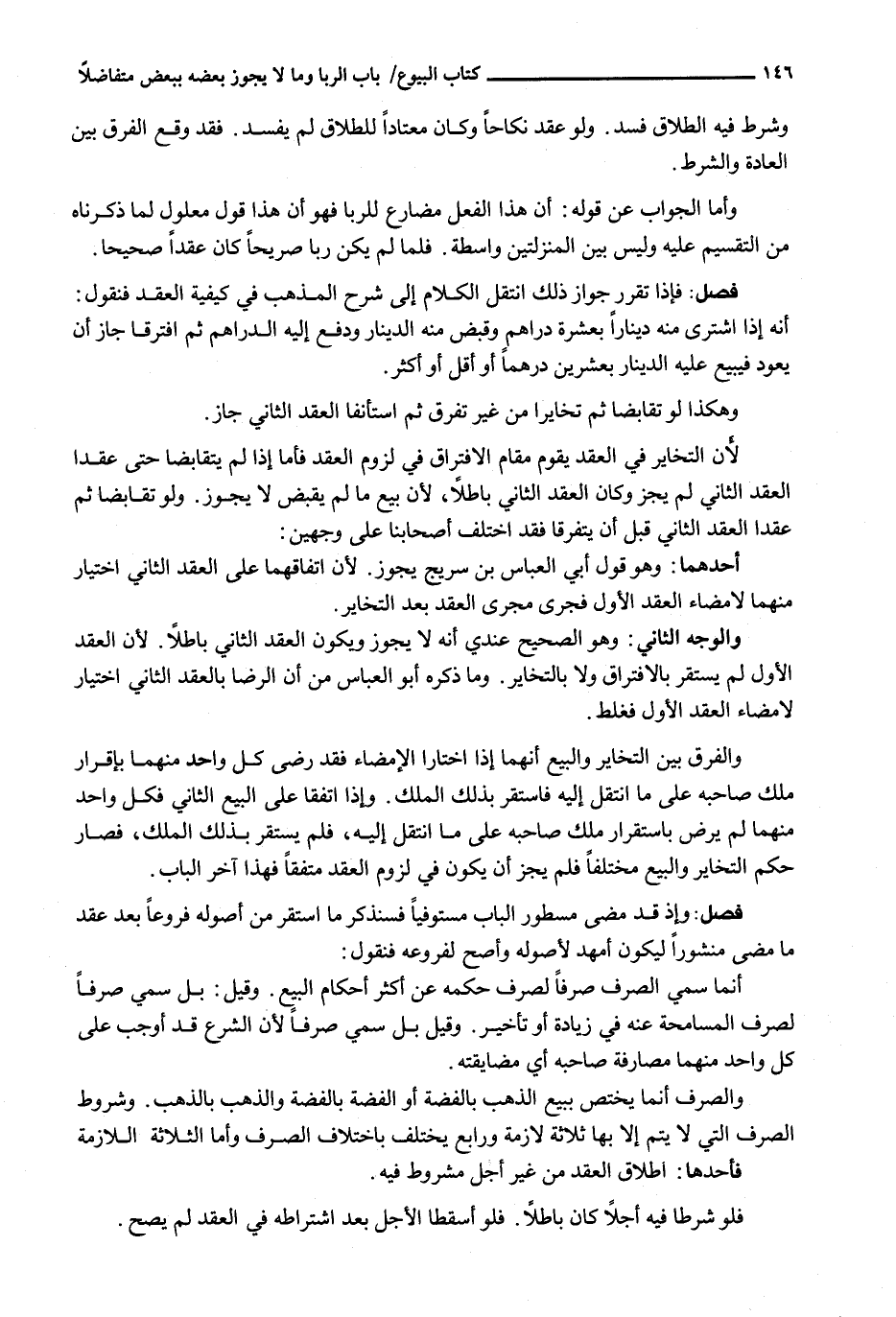 وَالصَّرْفُ إِنَّمَا يَخْتَصُّ بِبَيْعِ الذَّهَبِ بِالْفِضَّةِ أَوِ الفضة بالفضة والذهب الذهب. وَشُرُوطُ الصَّرْفِ الَّتِي لَا يَتِمُّ إِلَّا بِهَا ثَلَاثَةٌ لَازِمَةٌ وَرَابِعٌ يَخْتَلِفُ بِاخْتِلَافِ الصَّرْفِ وَأَمَّا الثَّلَاثَةُ اللَّازِمَةَ: