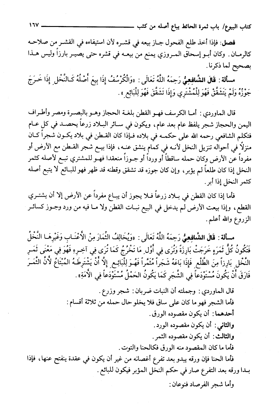 قَالَ الْمَاوَرْدِيُّ: أَمَّا الْكُرْسُفُ فَهُوَ الْقُطْنُ بِلُغَةِ الْحِجَازِ وَهُوَ بِالْبَصْرَةِ وَمِصْرَ وَأَطْرَافِ اليمن والحجاز شجر يلفظ عام بَعْدَ عَامٍ، وَيَكُونُ فِي سَائِرِ الْبِلَادِ زَرْعًا يُحْصَدُ فِي كُلِّ عَامٍ فَتَكَلَّمَ الشَّافِعِيُّ رَحِمَهُ اللَّهُ عَلَى حُكْمِهِ فِي بِلَادِهِ فَإِذَا كَانَ الْقُطْنُ فِي بِلَادٍ يَكُونُ شَجَرًا كَانَ مُنَزَّلًا فِي أَحْوَالِهِ تَنْزِيلَ النَّخْلِ لِأَنَّهُ فِي كِمَامٍ يَنْشَقُّ عَنْهُ، فَإِذَا بِيعَ شَجَرُ الْقُطْنِ مَعَ الْأَرْضِ أَوْ مُفْرَدًا عَنِ الْأَرْضِ وَكَانَ حَمْلُهُ سَاقِطًا أَوْ وَرْدًا أَوْ جَوْزًا مُنْعَقِدًا فَهُوَ لِلْمُشْتَرِي تَبَعٌ لِأَصْلِهِ كَثَمَرِ النَّخْلِ إِذَا كَانَ طَلْعًا لَمْ يُؤَبَّرْ، وَإِنْ كَانَ جَوْزُهُ قَدْ تَشَقَّقَ وَقَطْنُهُ قَدْ ظَهَرَ فَهُوَ لِلْبَائِعِ لَا يَتْبَعُ أَصْلَهُ كَثَمَرِ النَّخْلِ إِذَا أُبِّرَ.