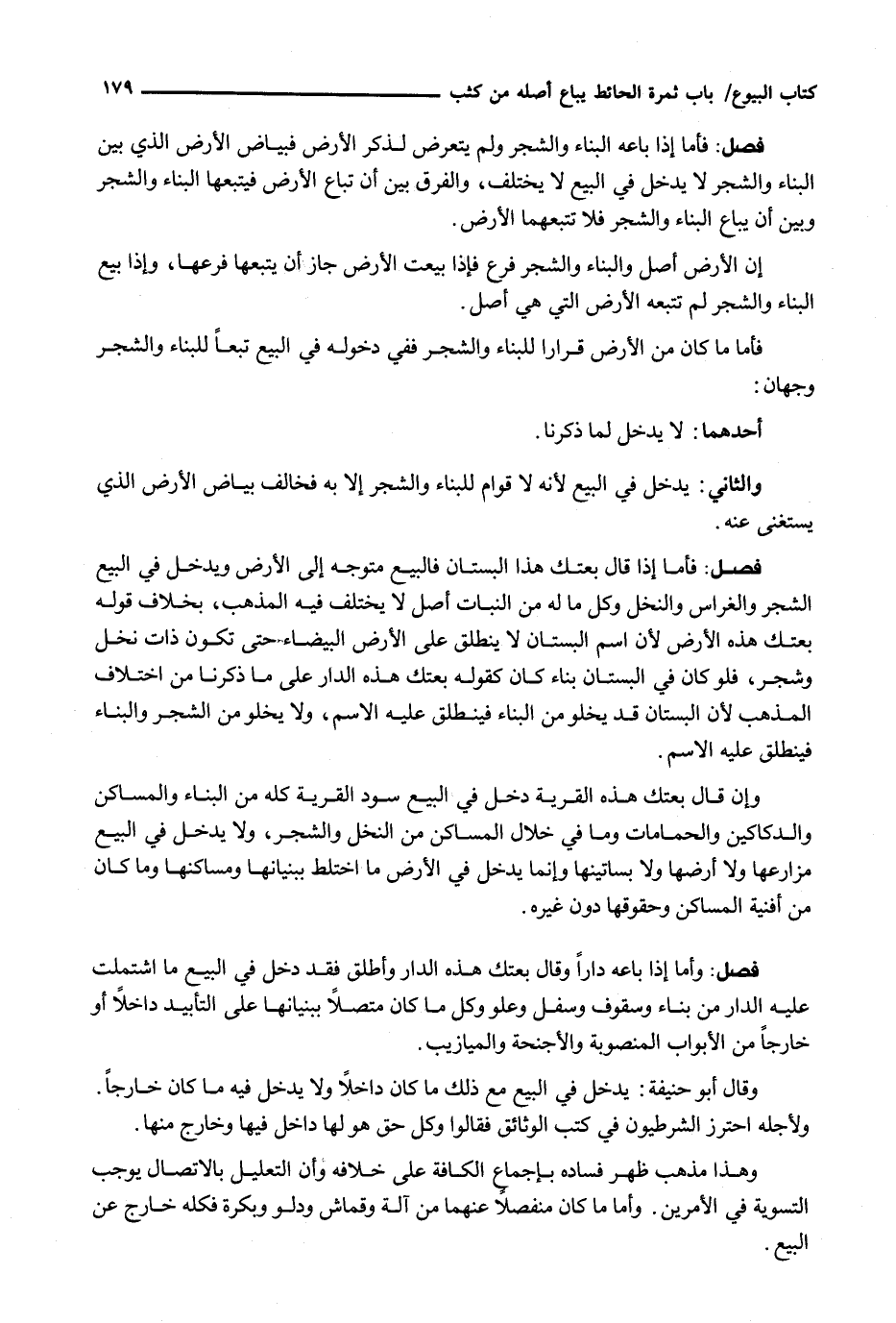 وَقَالَ أبو حنيفة: يَدْخُلُ فِي الْبَيْعِ مَعَ ذَلِكَ مَا كَانَ دَاخِلًا وَلَا يَدْخُلُ فِيهِ مَا كَانَ خَارِجًا. وَلِأَجْلِهِ احْتَرَزَ الشُّرْطِيُّونَ فِي كَتْبِ الْوَثَائِقِ فَقَالُوا وَكُلُّ حَقٍّ هُوَ لَهَا دَاخِلٌ فِيهَا وَخَارِجٌ مِنْهَا.