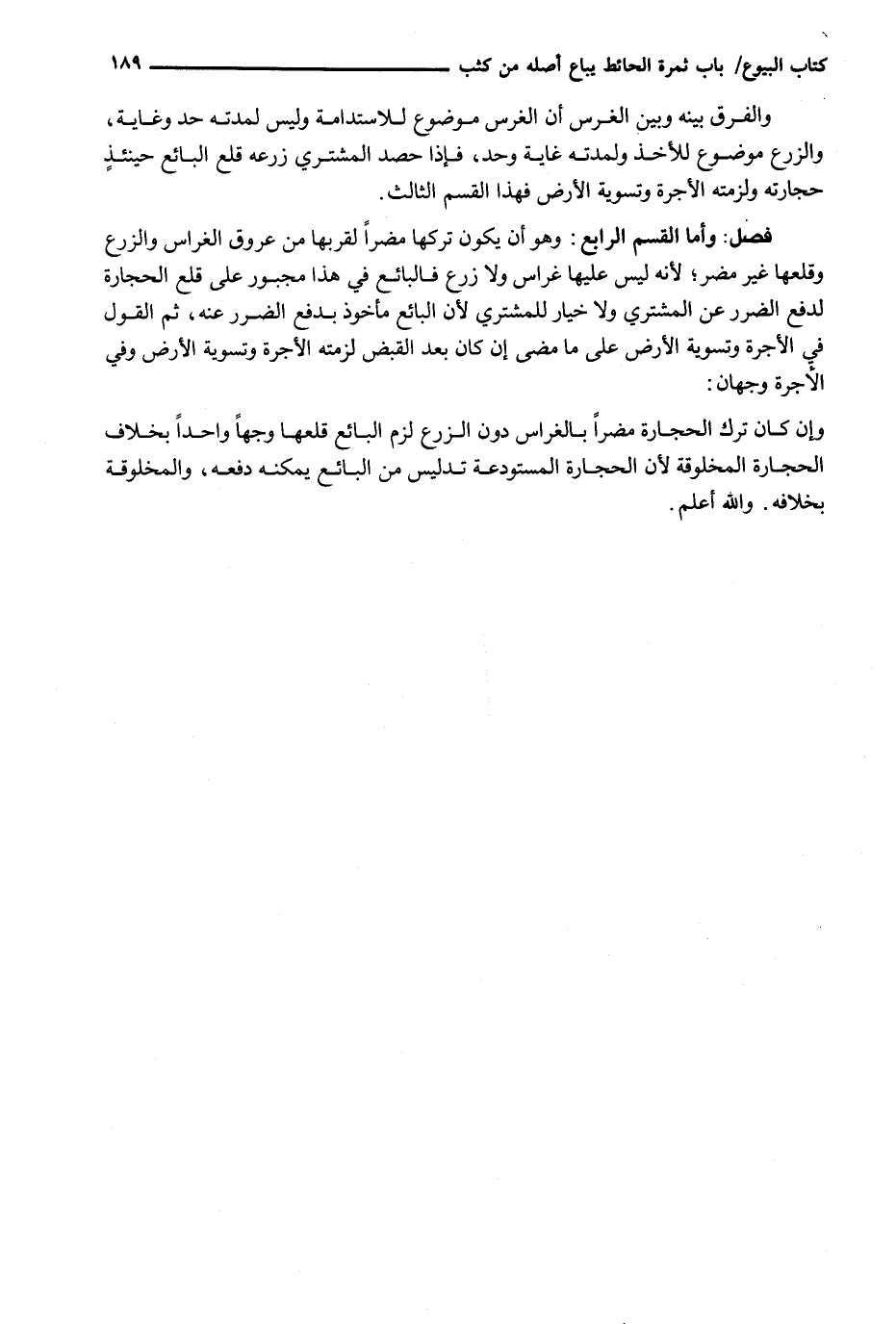 وَالْفَرْقُ بَيْنَهُ وَبَيْنَ الْغَرْسِ أَنَّ الْغَرْسَ مَوْضُوعٌ لِلِاسْتِدَامَةِ وَلَيْسَ لِمُدَّتِهِ حَدٌّ وَغَايَةٌ، وَالزَّرْعُ مَوْضُوعٌ للأخذ ولمدته غاية وحد، فَإِذَا حَصَدَ الْمُشْتَرِي زَرْعَهُ قَلَعَ الْبَائِعُ حِينَئِذٍ حِجَارَتَهُ وَلَزِمَتْهُ الْأُجْرَةُ وَتَسْوِيَةُ الْأَرْضِ فَهَذَا الْقِسْمُ الثَّالِثُ.