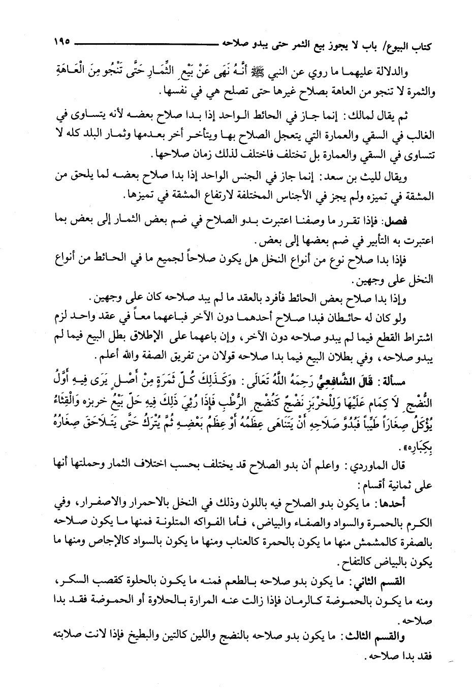 أَحَدُهَا: مَا يَكُونُ بُدُوُّ الصَّلَاحِ فِيهِ بِاللَّوْنِ وَذَلِكَ فِي النَّخْلِ بِالِاحْمِرَارِ وَالِاصْفِرَارِ، وَفِي الْكَرْمِ بِالْحُمْرَةِ وَالسَّوَادِ وَالصَّفَاءِ وَالْبَيَاضِ، فَأَمَّا الْفَوَاكِهُ الْمُتَلَوِّنَةُ فَمِنْهَا مَا يَكُونُ صلاحه بالصفرة كالمشمش منها مَا يَكُونُ بِالْحُمْرَةِ كَالْعُنَّابِ وَمِنْهَا مَا يَكُونُ بِالسَّوَادِ كَالْإِجَّاصِ وَمِنْهَا مَا يَكُونُ بِالْبَيَاضِ كَالتُّفَّاحِ.