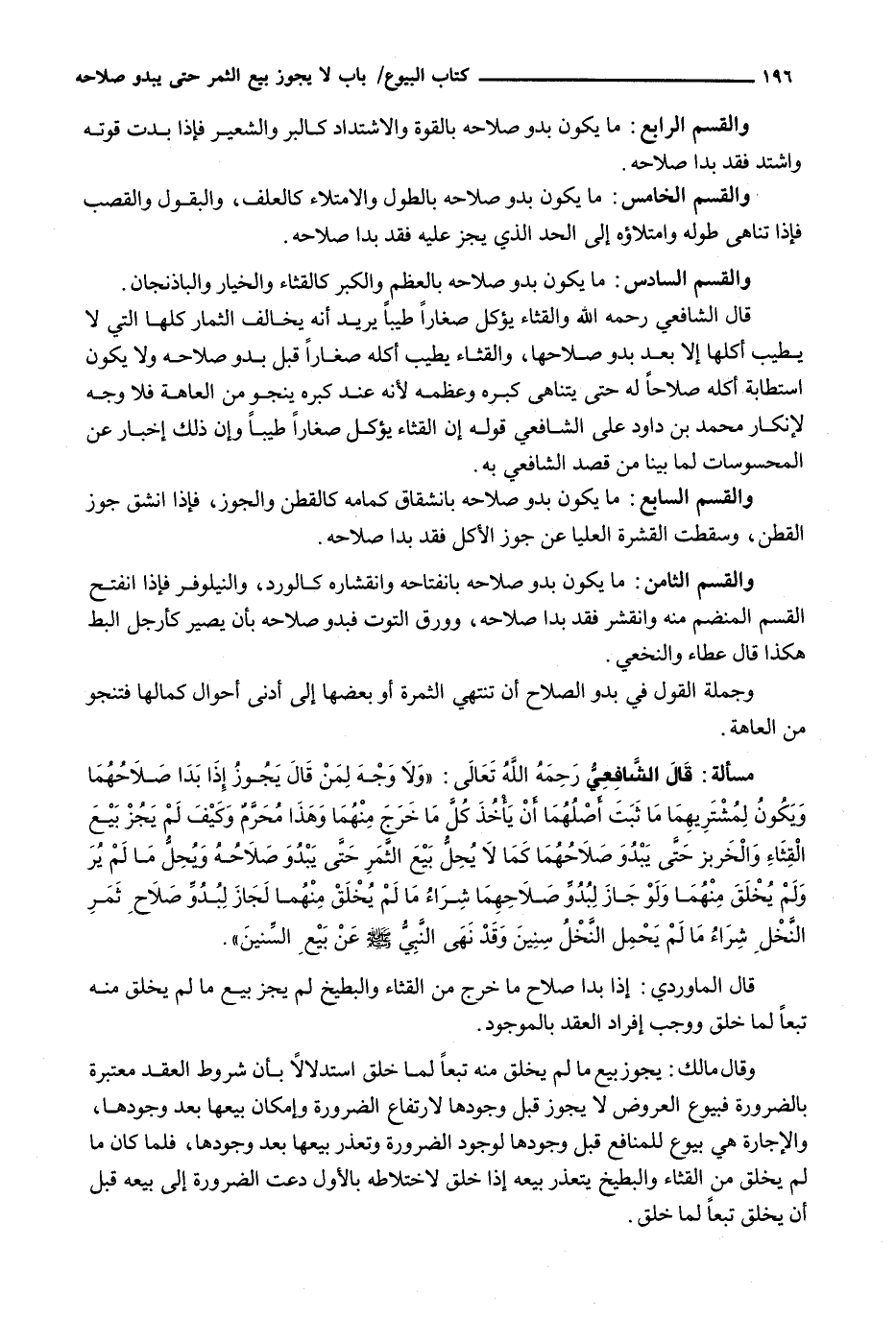 قَالَ الشَّافِعِيُّ رَحِمَهُ اللَّهُ وَالْقِثَّاءُ يُؤْكَلُ صِغَارًا طَيِّبًا يُرِيدُ أَنَّهُ يُخَالِفُ الثِّمَارَ كُلَّهَا الَّتِي لَا يَطِيبُ أَكْلُهَا إِلَّا بَعْدَ بُدُوِّ صَلَاحِهَا، وَالْقِثَّاءُ يَطِيبُ أَكْلُهُ صِغَارًا قَبْلَ بُدُوِّ صَلَاحِهِ وَلَا يَكُونُ اسْتِطَابَةُ أَكْلِهِ صَلَاحًا لَهُ حَتَّى يَتَنَاهَى كِبَرُهُ وَعِظَمُهُ لِأَنَّهُ عِنْدَ كِبَرِهِ يَنْجُو مِنَ الْعَاهَةِ فَلَا وَجْهَ لِإِنْكَارِ مُحَمَّدِ بْنِ دَاوُدَ عَلَى الشَّافِعِيِّ قَوْلَهُ إِنَّ الْقِثَّاءَ يُؤْكَلُ صِغَارًا طَيِّبًا وَإِنَّ ذَلِكَ إِخْبَارٌ عَنِ الْمَحْسُوسَاتِ لِمَا بَيَّنَّا مِنْ قَصْدِ الشَّافِعِيِّ بِهِ.