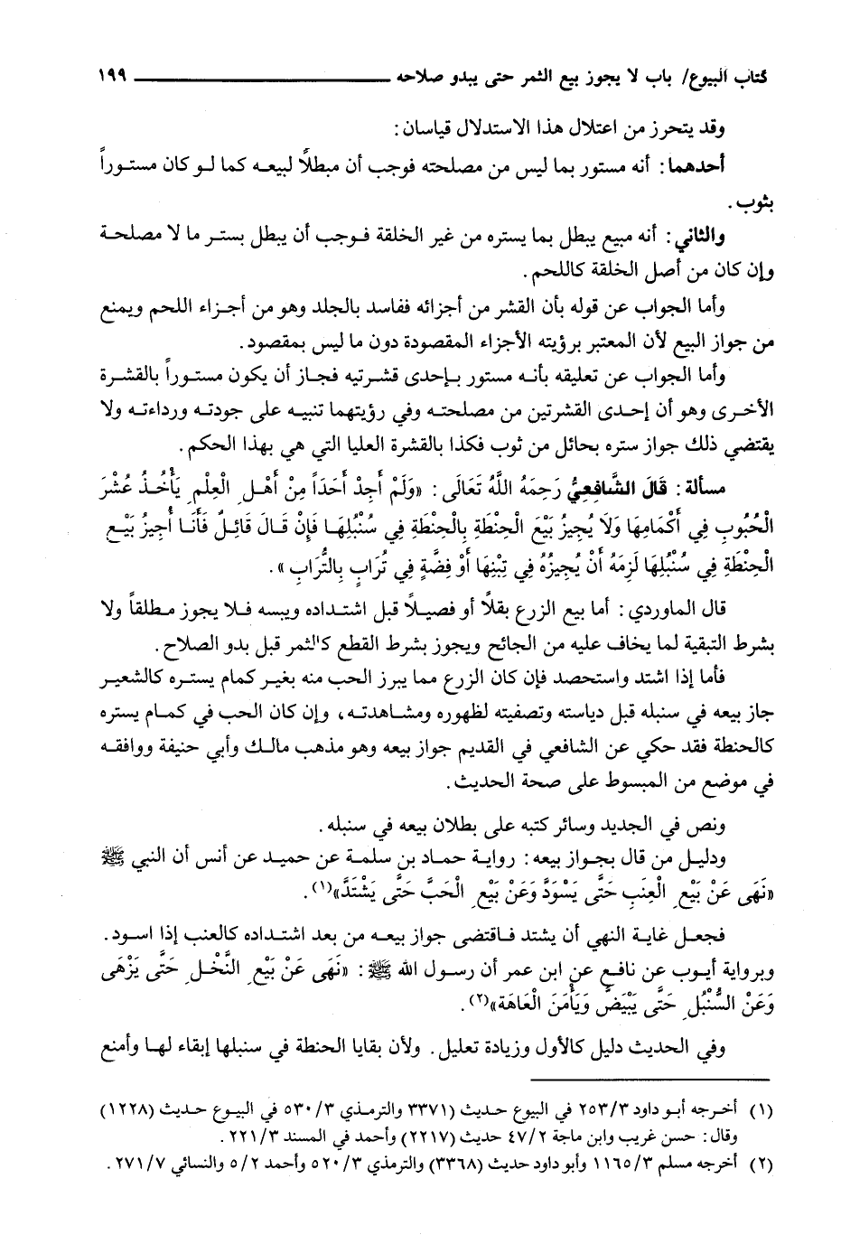 فَجَعَلَ غَايَةَ النَّهْيِ أَنْ يَشْتَدَّ فَاقْتَضَى جَوَازُ بَيْعِهِ مِنْ بَعْدِ اشْتِدَادِهِ كَالْعِنَبِ إِذَا اسْوَدَّ. وَبِرِوَايَةِ أَيُّوبُ عَنْ نَافِعٍ عَنِ ابْنِ عُمَرَ أَنَّ رَسُولَ اللَّهِ - صَلَّى اللَّهُ عَلَيْهِ وَسَلَّم َ -: " نَهَى عَنْ بَيْعِ النَّخْلِ حَتَّى يَزْهَى وَعَنِ السُّنْبُلِ حَتَّى يَبْيَضَّ وَيَأْمَنَ الْعَاهَةَ ".