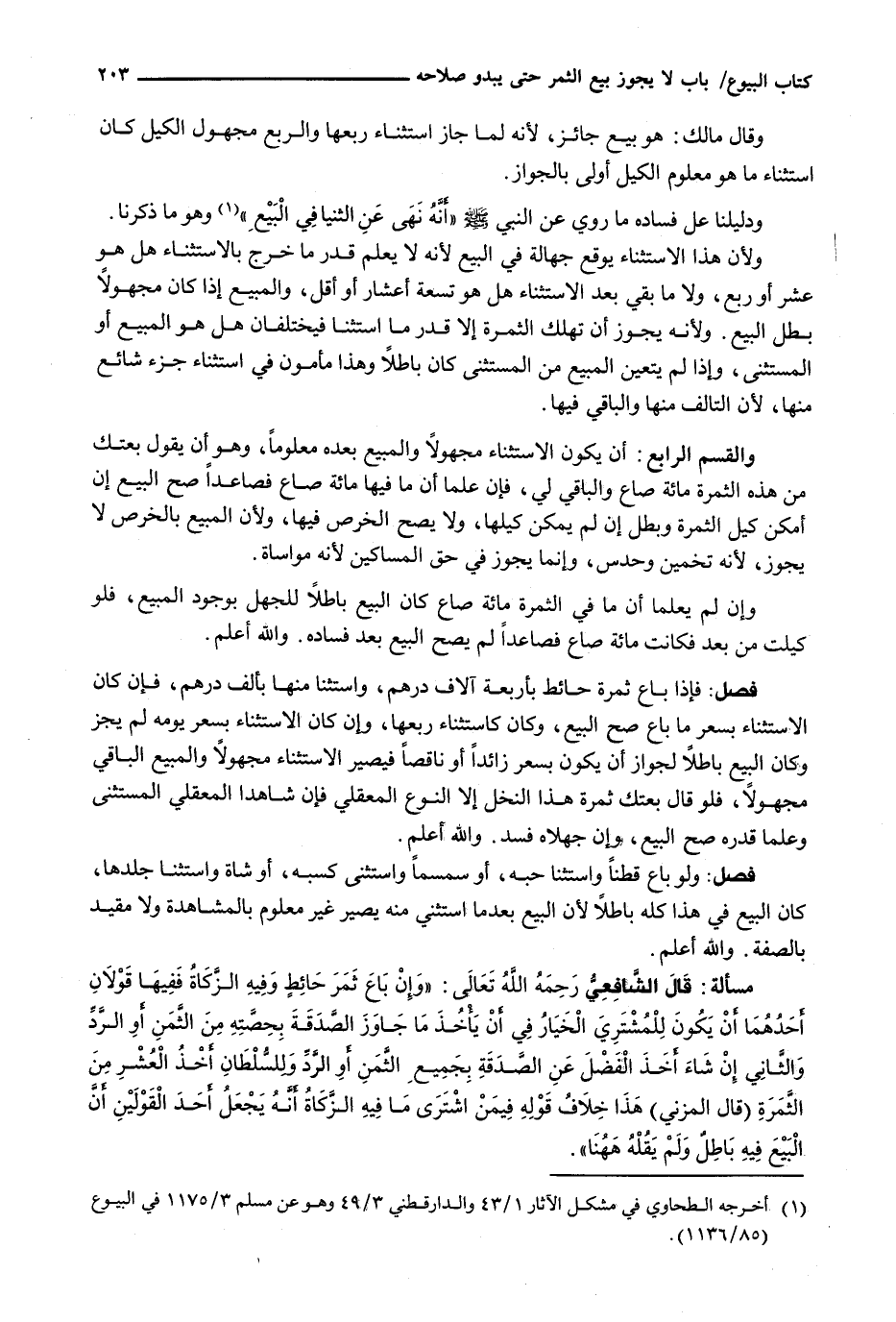 وَلِأَنَّ هَذَا الِاسْتِثْنَاءَ يُوقِعُ جَهَالَةً فِي الْبَيْعِ لِأَنَّهُ لَا يُعْلَمُ قَدْرُ مَا خَرَجَ بِالِاسْتِثْنَاءِ هَلْ هُوَ عُشْرٌ أَوْ رُبْعٌ، وَلَا مَا بَقِيَ بَعْدَ الِاسْتِثْنَاءِ هَلْ هُوَ تِسْعَةُ أَعْشَارٍ أَوْ أَقَلُّ، وَالْمَبِيعُ إِذَا كَانَ مَجْهُولًا بَطَلَ الْبَيْعُ. وَلِأَنَّهُ يَجُوزُ أَنْ تَهْلَكَ الثمرة إلا قدر ما استثنى فَيَخْتَلِفَانِ هَلْ هُوَ الْمَبِيعُ أَوِ الْمُسْتَثْنَى، وَإِذَا لَمْ يَتَعَيَّنْ الْمَبِيعُ مِنَ الْمُسْتَثْنَى كَانَ بَاطِلًا وَهَذَا مَأْمُونٌ فِي اسْتِثْنَاءِ جُزْءٍ شَائِعٍ مِنْهَا، لِأَنَّ التَّالِفَ مِنْهَا وَالْبَاقِي فِيهَا.