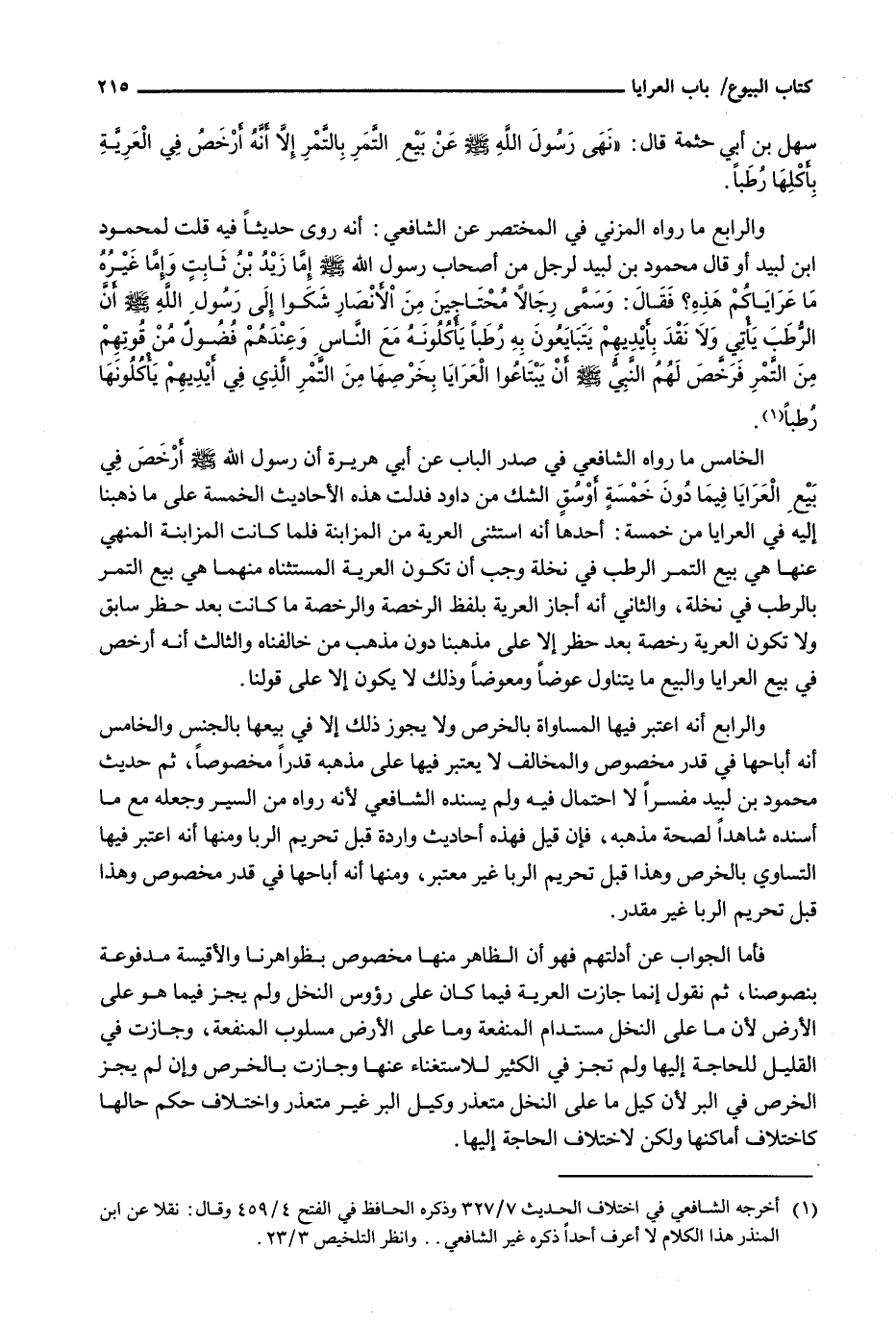 وَالرَّابِعِ أَنَّهُ اعْتَبَرَ فِيهَا الْمُسَاوَاةَ بِالْخَرْصِ وَلَا يَجُوزُ ذَلِكَ إِلَّا فِي بَيْعِهَا بِالْجِنْسِ وَالْخَامِسِ أَنَّهُ أَبَاحَهَا فِي قَدْرٍ مَخْصُوصٍ وَالْمُخَالِفُ لَا يَعْتَبِرُ فِيهَا عَلَى مَذْهَبِهِ قَدْرًا مَخْصُوصًا، ثُمَّ حديث محمود بن لبيد مفسرا لَا احْتِمَالَ فِيهِ وَلَمْ يُسْنِدْهُ الشَّافِعِيُّ لِأَنَّهُ رَوَاهُ مِنَ السِّيَرِ وَجَعَلَهُ مَعَ مَا أَسْنَدَهُ شَاهِدًا لِصِحَّةِ مَذْهَبِهِ، فَإِنْ قِيلَ فَهَذِهِ أَحَادِيثُ واردة قبل تحريم الربا وَمِنْهَا أَنَّهُ اعْتُبِرَ فِيهَا التَّسَاوِي بِالْخَرْصِ وَهَذَا قَبْلَ تَحْرِيمِ الرِّبَا غَيْرُ مُعْتَبِرٍ، وَمِنْهَا أَنَّهُ أَبَاحَهَا فِي قَدْرٍ مَخْصُوصٍ وَهَذَا قَبْلَ تَحْرِيمِ الرِّبَا غَيْرُ مُقَدَّرٍ.
