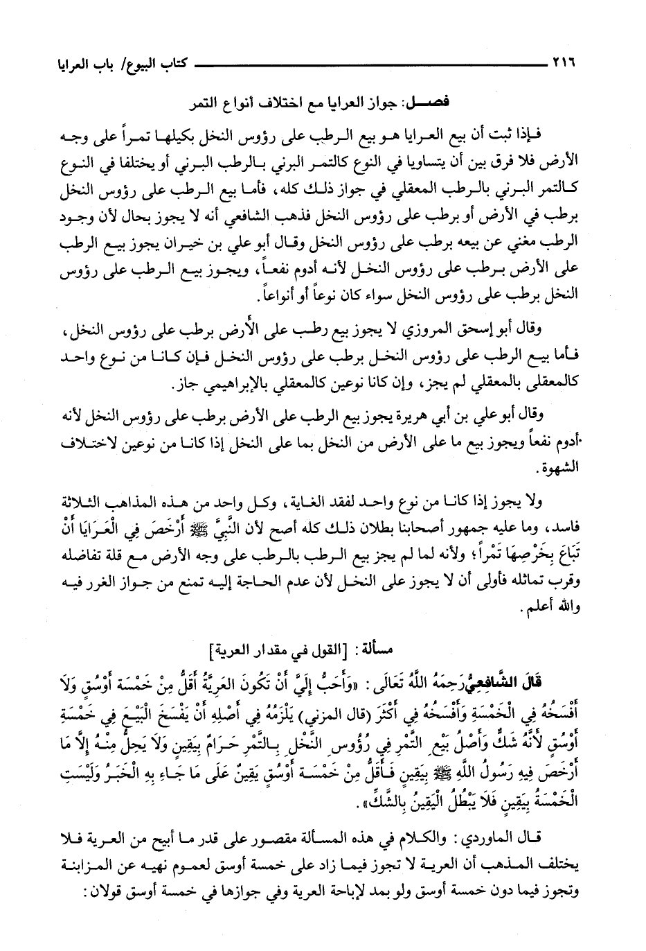 قَالَ الْمَاوَرْدِيُّ: وَالْكَلَامُ فِي هَذِهِ الْمَسْأَلَةِ مَقْصُورٌ عَلَى قَدْرِ مَا أُبِيحَ مِنَ الْعَرِيَّةِ فَلَا يَخْتَلِفُ الْمَذْهَبُ أَنَّ الْعَرِيَّةَ لَا تَجُوزُ فِيمَا زَادَ عَلَى خَمْسَةِ أَوْسُقٍ لِعُمُومِ نَهْيِهِ عَنِ الْمُزَابَنَةِ وَتَجُوزُ فِيمَا دُونَ خَمْسَةِ أَوْسُقٍ وَلَوْ بِمَدٍّ لِإِبَاحَةِ الْعَرِيَّةِ وَفِي جَوَازِهَا فِي خَمْسَةِ أوسق قولان: